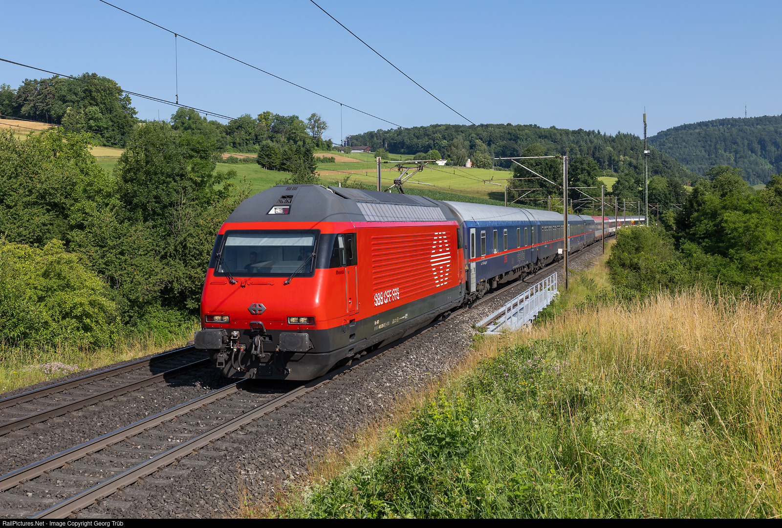 | Re 460 # 024 of the SBB pulls NightJet 471 from Hamburg Altona to Zürich on the Bözberg north ramp between Hornussen and Effingen. |