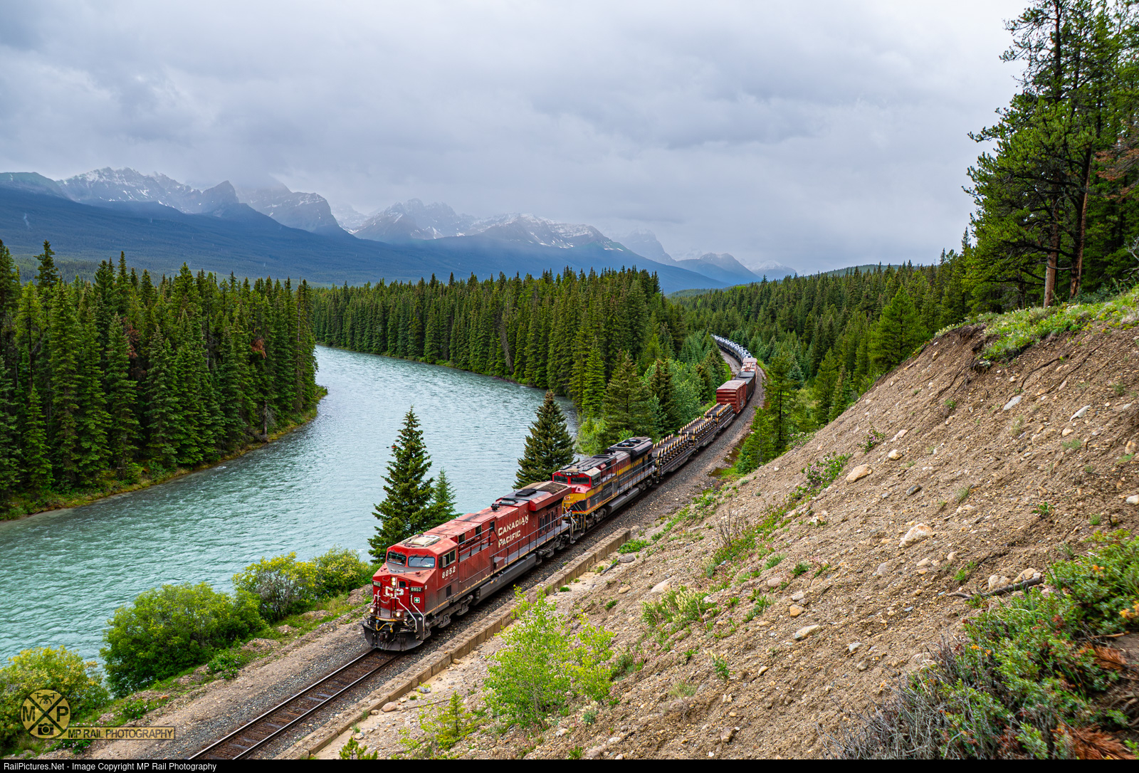 A CPKC manifest with CP and KCS power follows the Bow River as it heads eastbound on the Laggan Subdivision.