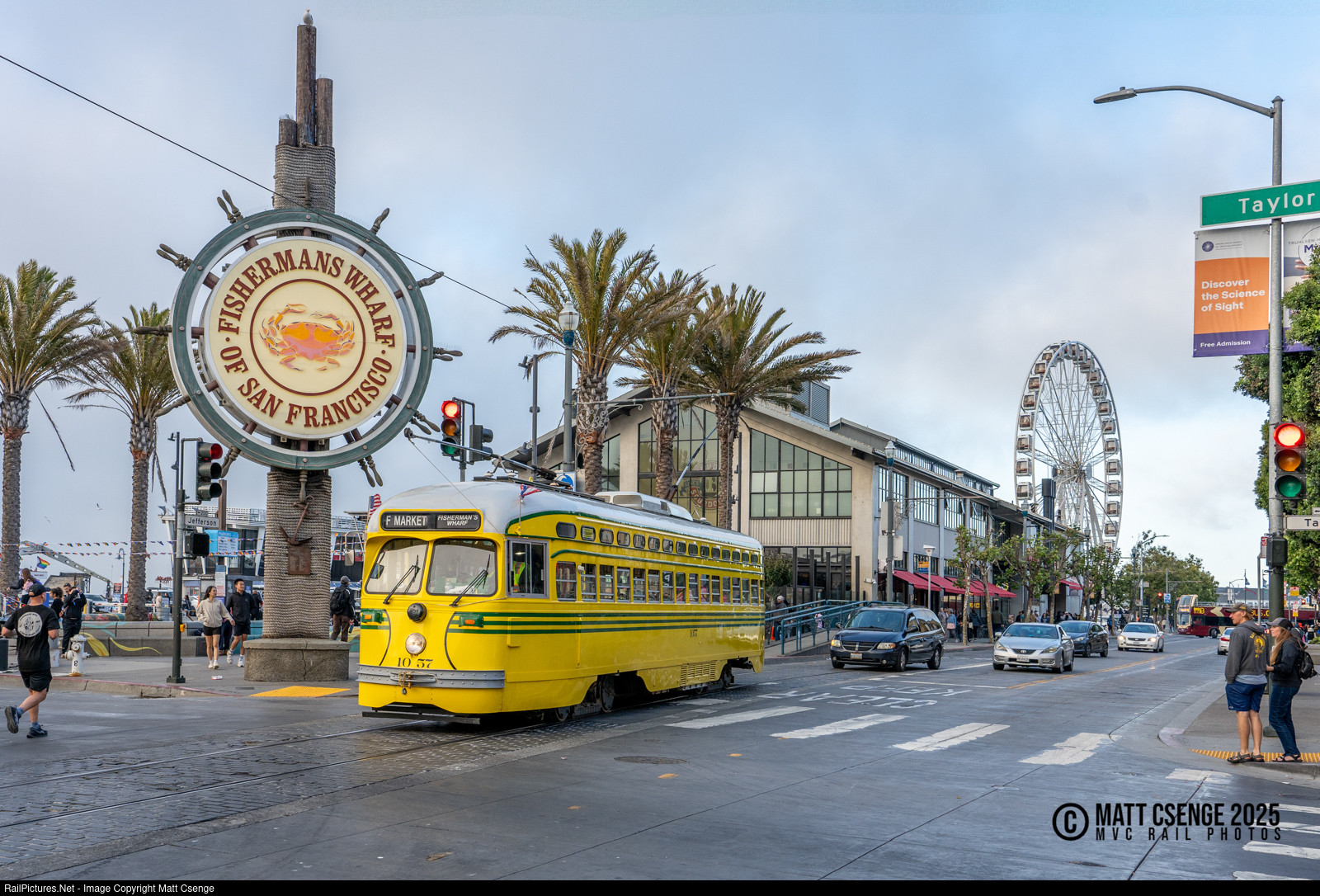 San Francisco Municipal Railway (MUNI) PCC car no. 1057 is seen passing the iconic Fisherman's Wharf sign on Jefferson St as it nears the end of its F line run from Castro. The car sports the bright yellow livery of the Cincinnati Street Railway, a now defunct transit agency that operated such cars. |