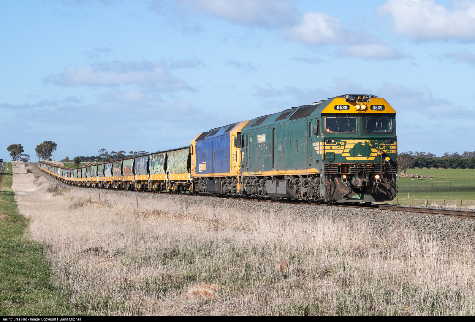 | Pacific National FA liveried G539 along with BL31 lead empty grain train 7731V from Geelong Grain Loop to Murtoa, seen rising out of the dip at Wingeel. 18/7/25 |