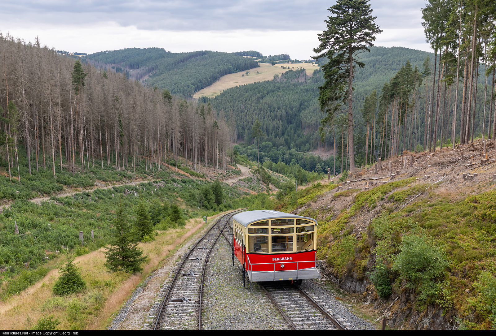 The Oberweissbacher Bergbahn, renamed the Thüringer Bergbahn in 2020, is a railway line in the Thuringian Slate Mountains, now operated by DB RegioNetz Verkehrs GmbH Oberweißbacher Berg- und Schwarzatalbahn. Since 1922, it has connected the Obstfelderschmiede stop on the Schwarzatal Railway with the municipality of Cursdorf. To overcome the height difference of more than 300 meters between the Schwarzatal valley and the plateau, a funicular railway with a gauge of 1800 mm was built from Obstfelderschmiede to Lichtenhain. In the middle of the funicular the car "Lichtenhain" is crossing the "Cabrio car", loaded on the "Güterbühne", in the Abt system passing loop.