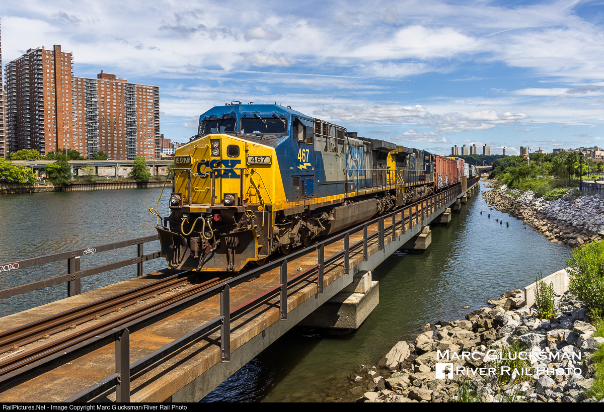 CSX On The Water. On Friday, July 18, 2025, CSX M701 was recrewed by Y102 at Croton West Yard in Croton-On-Hudson, New York, and made a daylight trip to the Oak Point Yard in The Bronx, New York. Matched YN2 AC44CWs CSXT 467 and 476 gave the move a vintage feel. This southbound train and its northbound counterpart, M702, normally run at night and only see daylight under unusual circumstances. When they do, however, it motivates railfans to go out and see the only freight trains that travel through this densely populated area of New York City. The train is headed down the Oak Point Link near Bronx Point.