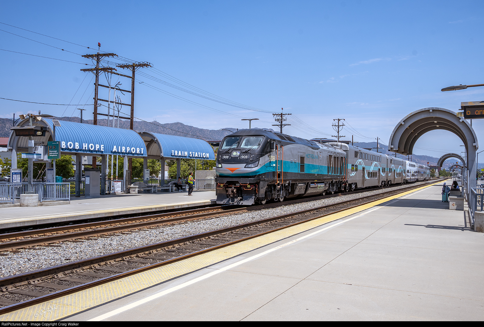 Rolling into the Amtrak/Metrolink station at Burbank's Bob Hope Airport (the city's other passenger rail station), Metrolink F125 908 is taking train 121 from downtown Los Angeles to Moorpark. As the name implies, this station is across the street, and walking distance, from Bob Hope Airport (BUR). It is a smaller airport, but can be a very convenient way to fly out of the Los Angeles area, provided this airport has flights that fit your travel plans. (I've taken the train here from Orange County to avoid Los Angeles' busy LAX airport a few times.) Along with Metrolink's Ventura County Line trains, Amtrak's Pacific Surfliners also stop here, as does AMTK train 11, the southbound Coast Starlight. (Burbank, California – July 17, 2025)