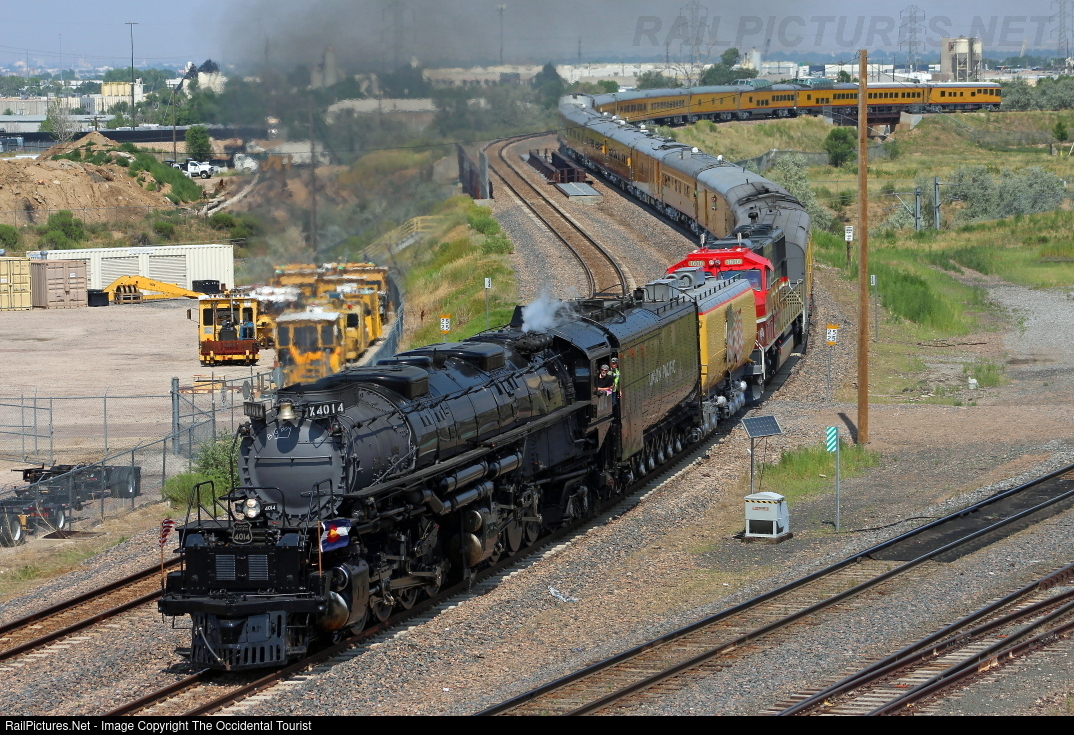 | After traveling down from Cheyenne and unloading passengers, the 4014 and train are making a move over the Belt Line to tie up in North Yard. First, they have to move west along the Moffat Tunnel Subdivision a mile or two before backing into North Yard, which is where most of the steam specials rest between runs. |