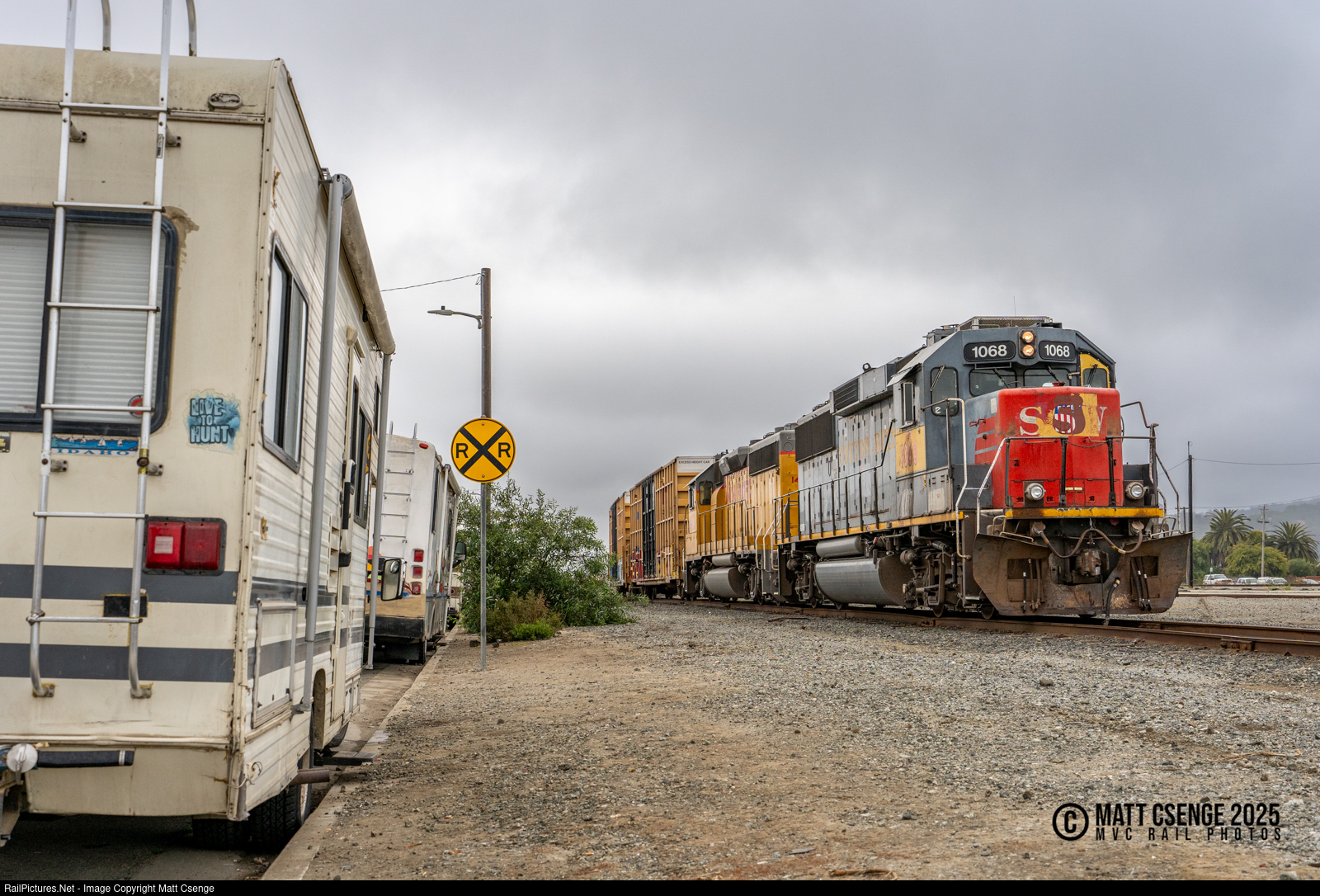 Union Pacific Railroad (UP) GP60 no. 1068 - still sporting patched St. Louis Southwestern (SSW) paint - is seen idling in Watsonville Junction Yard while shuffling cars. As is evidenced by the iconic "bloody nose" paint scheme, the SSW was a Southern Pacific (SP) subsidiary, having been acquired by the latter in 1932 and remaining so until 1992. The SP merged into the UP just four years later. |