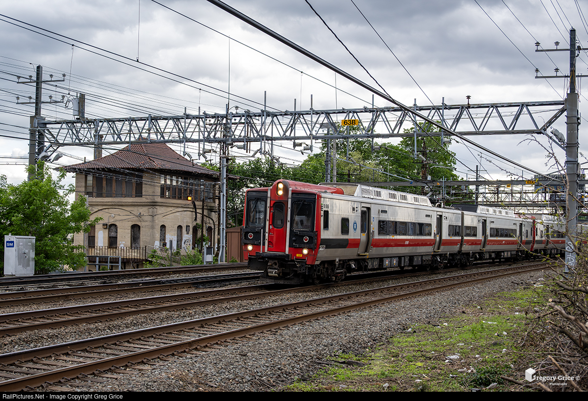 On a cloudy May 18th, 2025, Metro-North Railroad Train 6348, with a set of Kawasaki M8s, passes Shell Tower (SS22) as it treks through CP 216 on the New Haven Line in New Rochelle, New York. Recent shoulder rehabilitation work on Interstate 95 by the New York State Thruway Authority (NYSTA) has made the tower visible again from the highway shoulder.