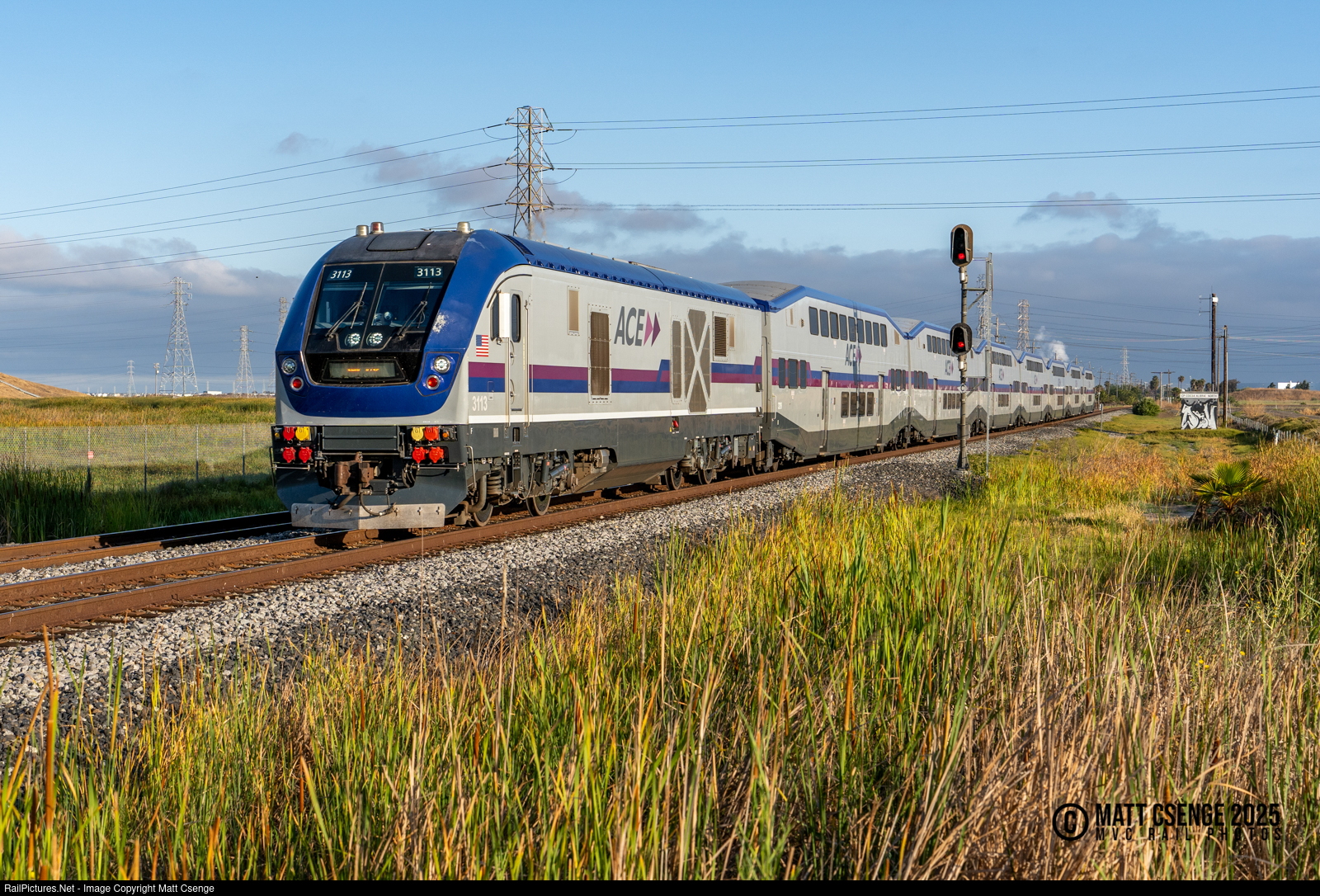 Altamont Corridor Express (ACE) SC-44 Charger 3113 leads a matched set of cars through the marshlands in Fremont, operating as train 03 to San Jose.