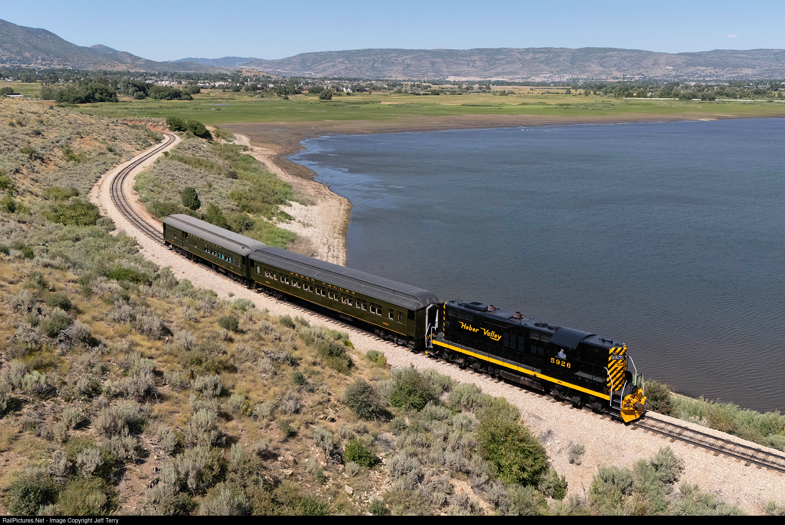 | Ain't it Grande? Heber Valley Railroad GP9 5926 does its best to channel the D&RGW vibes as it rounds Deer Creek Reservoir on its trip to Decker Bay. The Rio Grande often used Geeps on this line in the 1960s. No. 5926 is former Boston & Maine 52. |