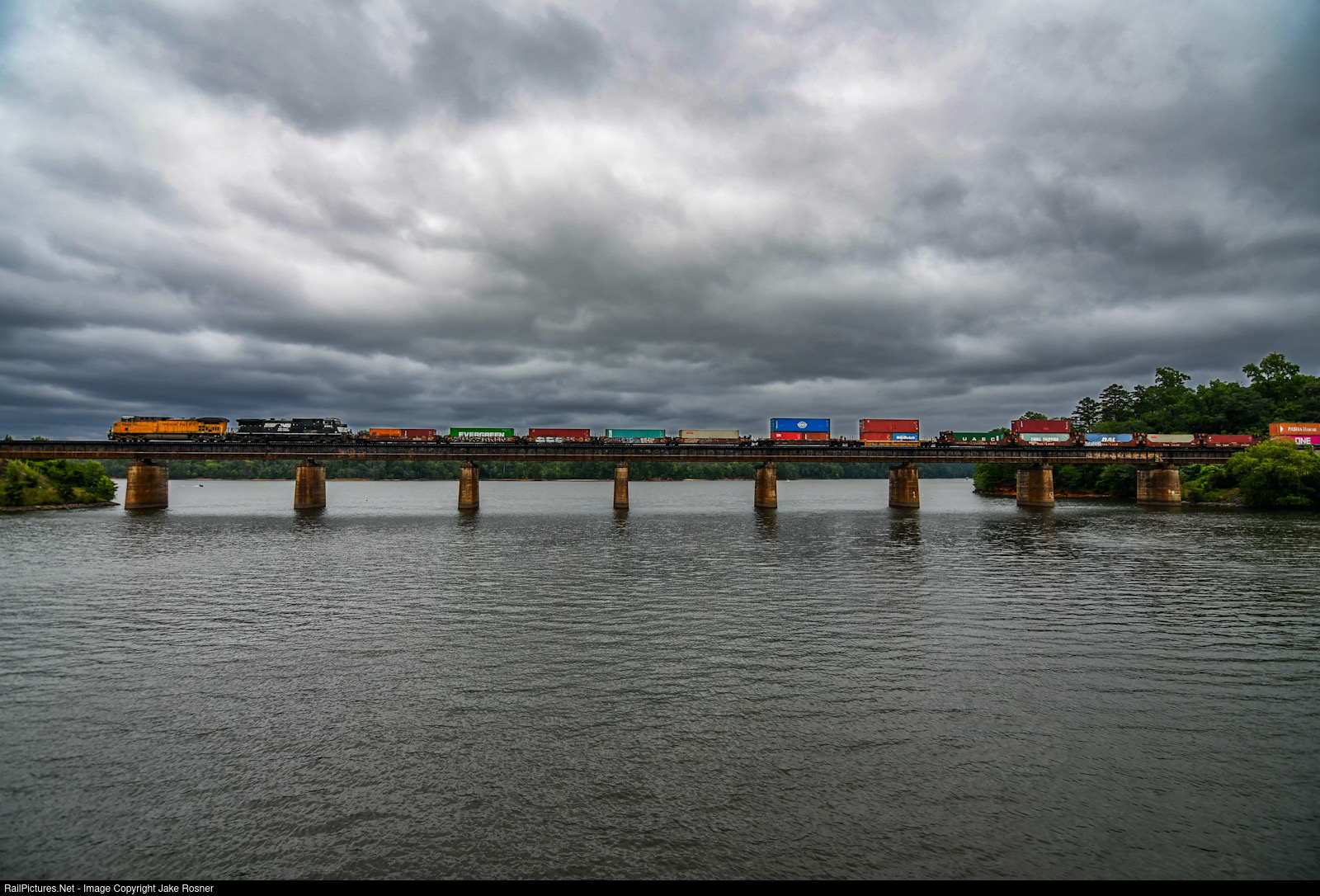NS 243 flies over the trestle in Clemson after holding in Greenville for the majority of the day. Union Pacific 9644 leads the way.