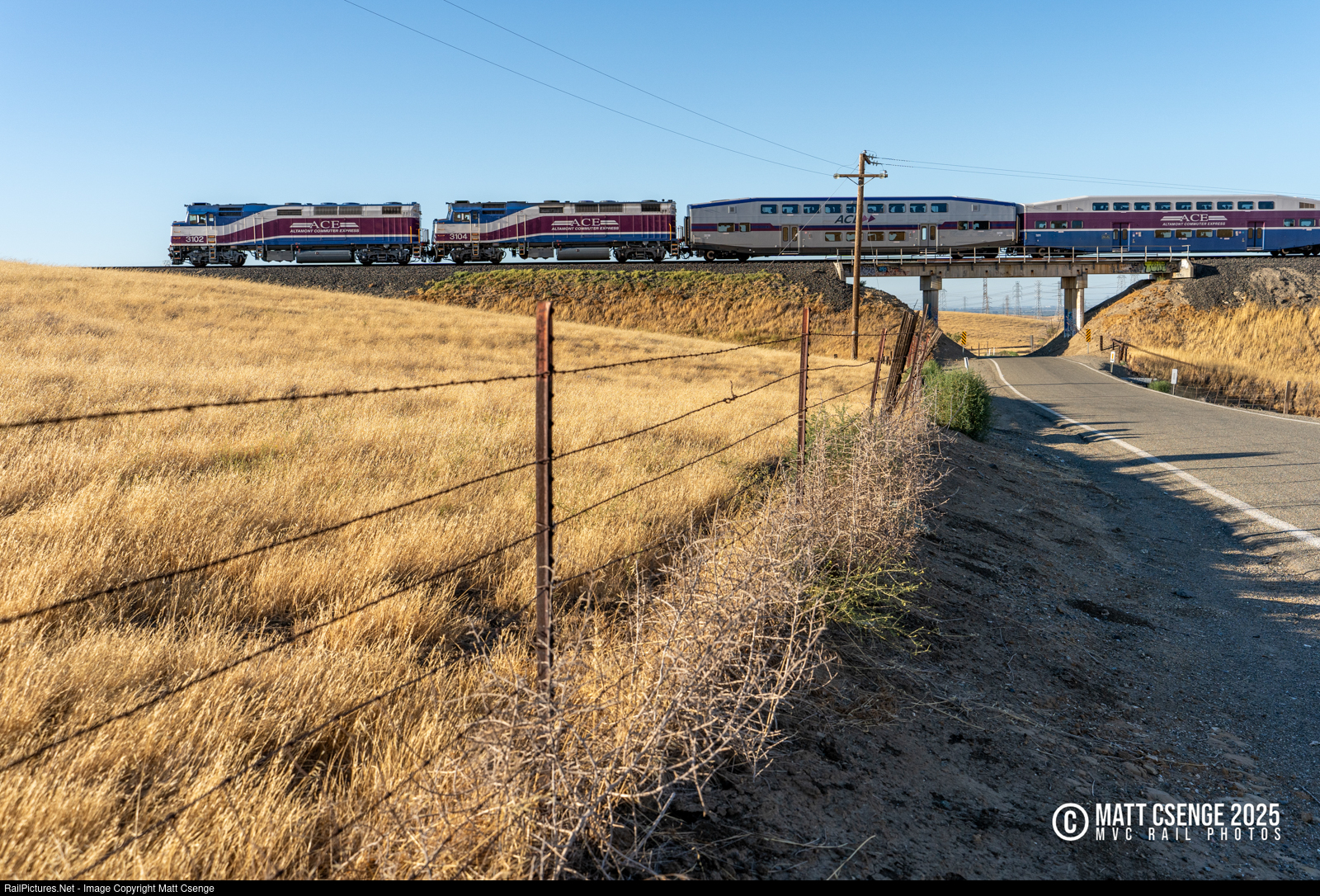 A pair of Altamont Corridor Express (ACE) F40PH locomotives - no.s 3102 and 3104 - are seen shoving train 08 over Patterson Pass Road as they descend the former Western Pacific main line into the Central Valley, heading towards Stockton. |