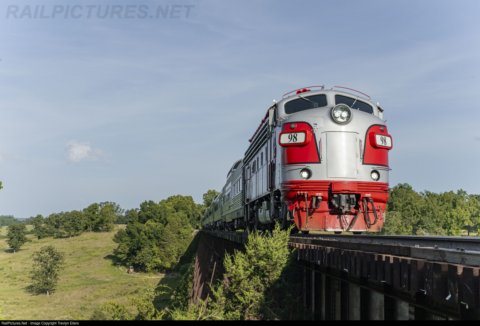 Branson Scenic's flagship F-unit 98 poses as it crosses the Barren Fork Trestle on an extra run for a commercial shoot.