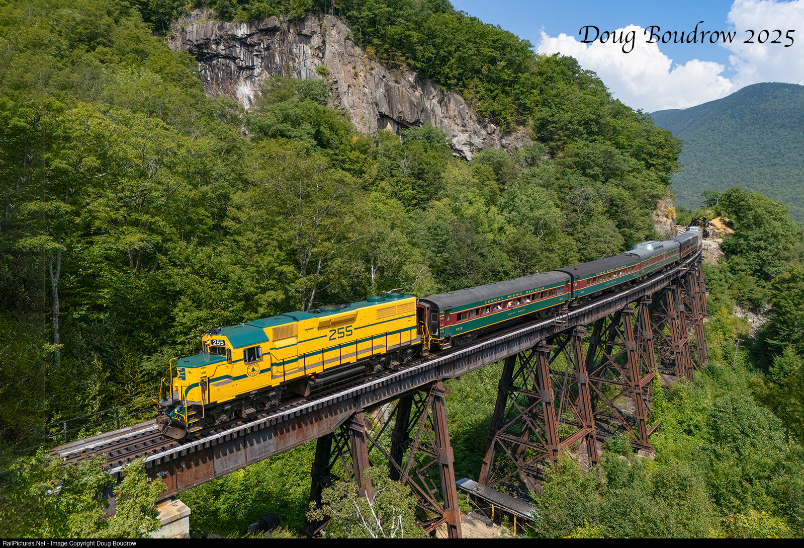 In 2022 Conway Scenic purchased GP38 255 from Vermont Rail Systems. It was built in 1966 for Maine Central Railroad and has joined sister locomotive 252 pulling trains on home rails over Crawford Notch. The railroad used the engine for three years in Vermont Rail Systems red, but recently panted it in a Maine Central inspired heritage scheme. The 9am Mountaineer is seen crossing the 520' Frankenstein Trestle, with the namesake Frankenstein Cliffs high above the train.