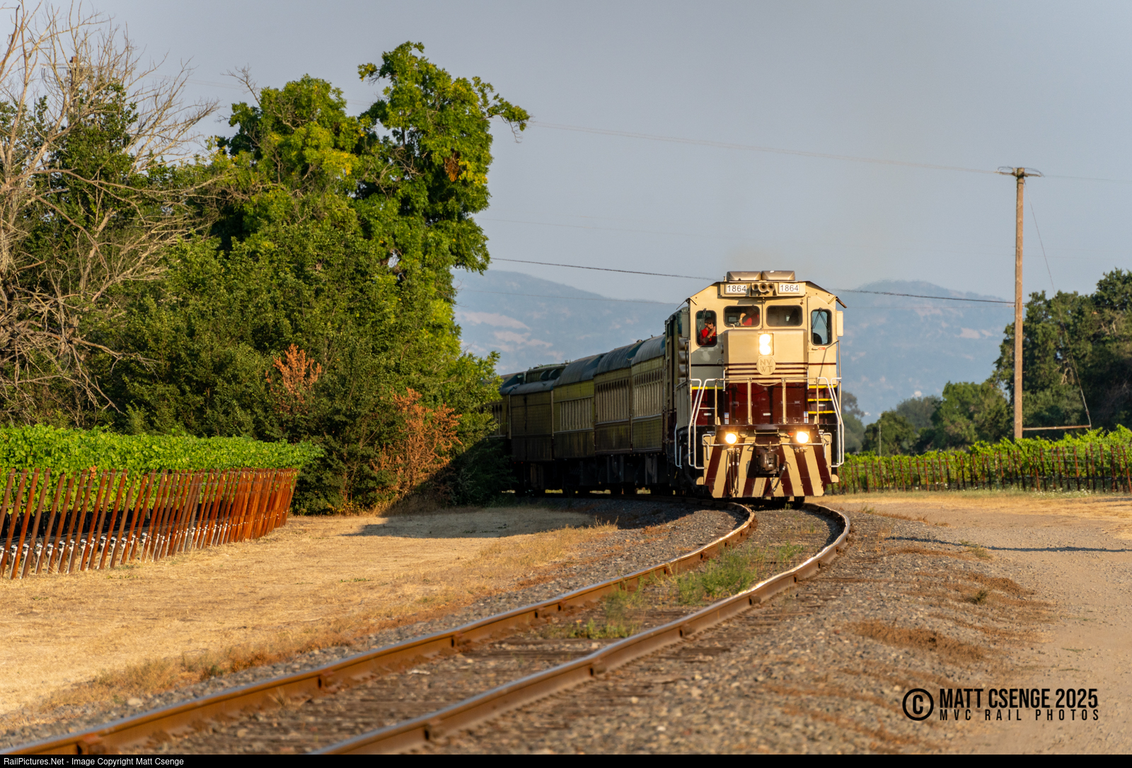 The Napa Valley Wine Train is seen curving through vineyards as it runs a dinner excursion through the beautiful landscape. In charge of the train is NZE15B locomotive 1864, which arrived at the railroad in 2023 and replaced the classic FPA-4 locomotives that operated the service for many years. |