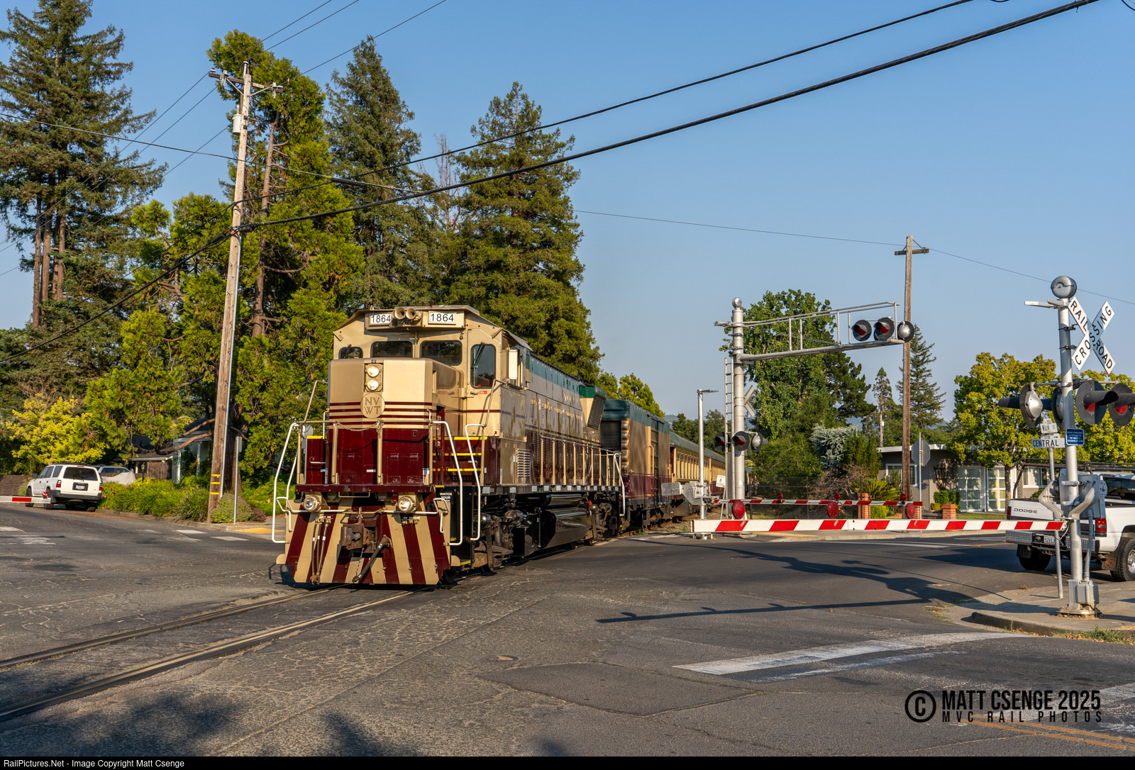 Napa Valley Railroad NZE15B no. 1864 is seen hauling the Napa Valley Wine Train through the grade crossing at Main St / Central Ave as it operates a dinner train excursion north through wine country. As an aside, this was by far the best smelling train I've ever photographed! |