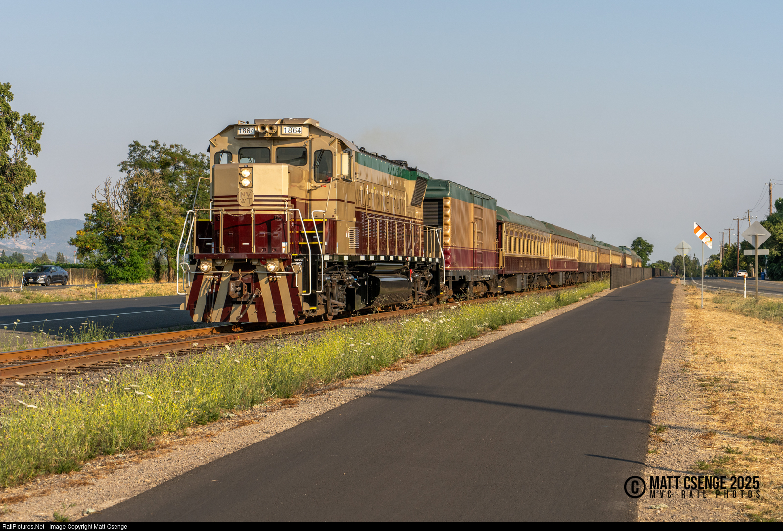 Napa Valley Railroad's new KLW NZE15B locomotive 1864 is seen leading the wine train along Route 29, operating a dinner excursion through beautiful wine country. The new Tier 4 compliant locomotive - a second of which will arrive in the future - has sidelined the classic ALCO FPA-4s that previously operated the service, with them likely destined to be scrapped per California Air Resources Board requirements. |