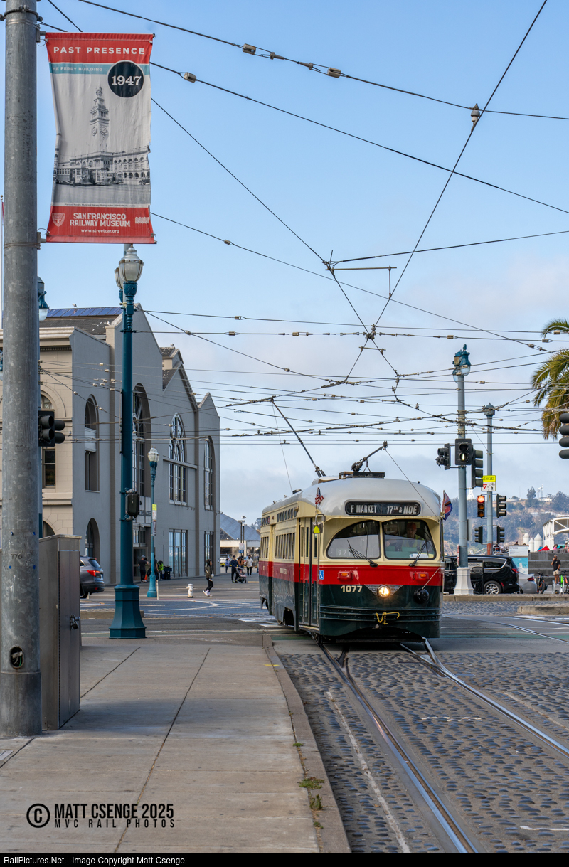 San Francisco Municipal Railway (Muni) PCC car 1077 is seen arriving at Don Chee Way & Steuart St Station while operating an F Market & Wharves service to 17th & Castro. The car is painted in the livery of the Birmingham Electric Co., which operated PCCs on its streetcar lines in Alabama from 1947 to 1953 - one of only two southern cities to operate PCCs. |