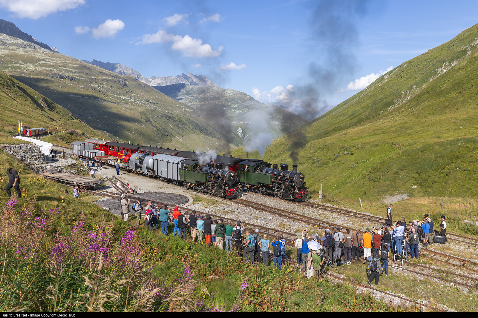 At the end of the photo trip organized by P.M. and the DFB with two trains from Realp to Furka DFB, a large number of photographers, staff, and extras gathered at 2,160 meters above sea level in Furka DFB, at the eastern portal of the Furka summit tunnel. After passing the locomotives, the two trains returned to Realp DFB, stopping to take on water in Tiefenbach DFB.