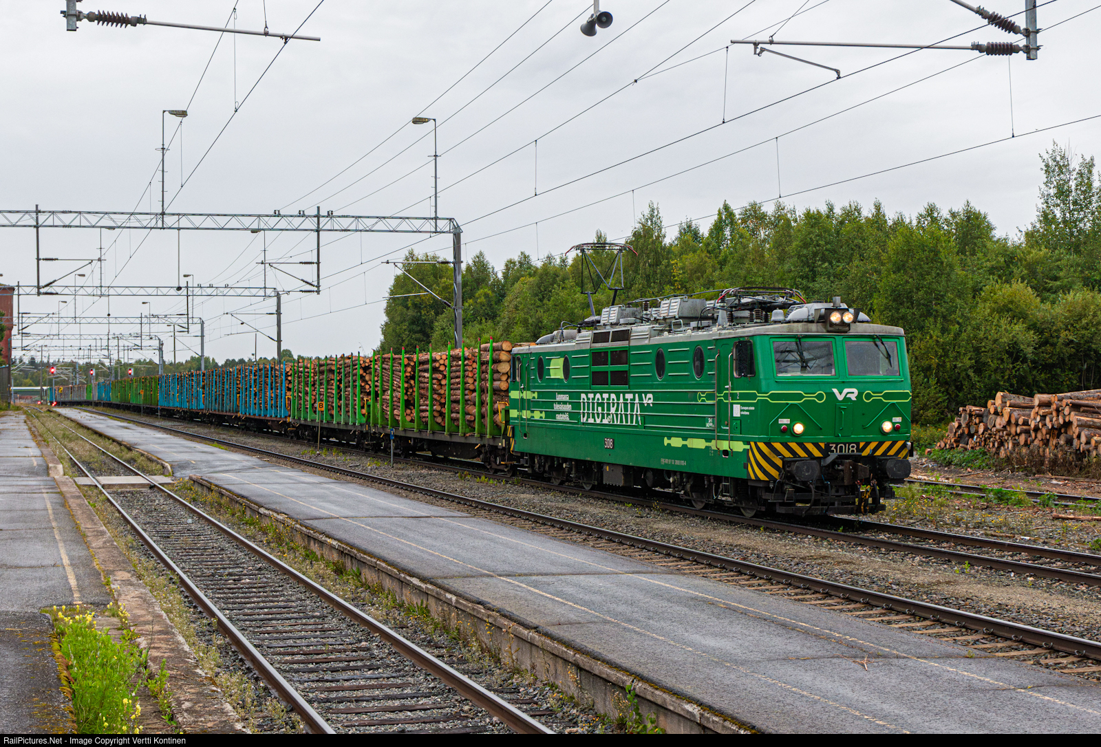 | The ETCS safety system test locomotive Sr1 3018 arriving to Hankasalmi station with timber train T 4337 to meet two oncoming trains. 3018 is being used for testing the ETCS train protection system on the Kouvola-Hamina line where ETCS is being tested for future use on all of Finnish railway network replacing the current JKV system from the, 90s. However when tests are not being conducted, 3018 can be found on any regular train, just like T 4337 from Jyväskylä to Pieksämäki. The locomotive has also been wrapped in a special "Digirata" (digital railway) livery with a slogan "Luomassa tulevaisuuden rautateitä" (creating the railways of future). |