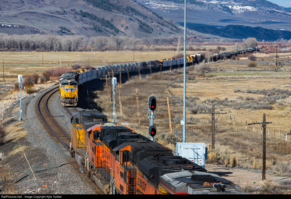 UP's MGJNY eases up to the signal at 'Troublesome' to meet the CMSEY. Both trains quickly realized that they were both too long for the meet and after a lengthy conversation with the dispatcher the CMSEY shoved 4 miles back to 'Flat' for the meet.