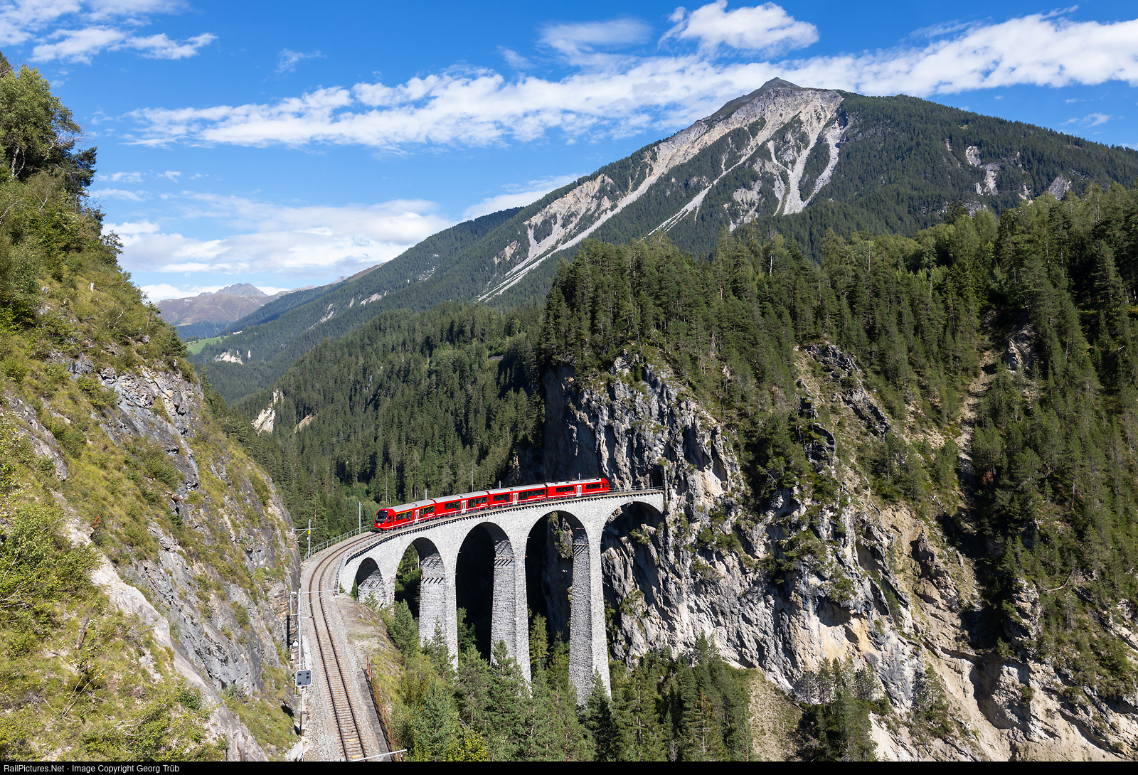 | Because the Ge 4/4 II # 614 locomotive of the shuttle train normally used for the viaduct shuttle with the open observation car was defective, the “Capricorn” ABe 4/16 # 3132 "Piz Daint" was used instead. Shortly after 4 p.m., the train 4151 of the line R28 from Alvaneu to Filisur is crossing the 65 meter high Landwasser viaduct, with Muchetta mountain above and Büelenhorn left in the background. |