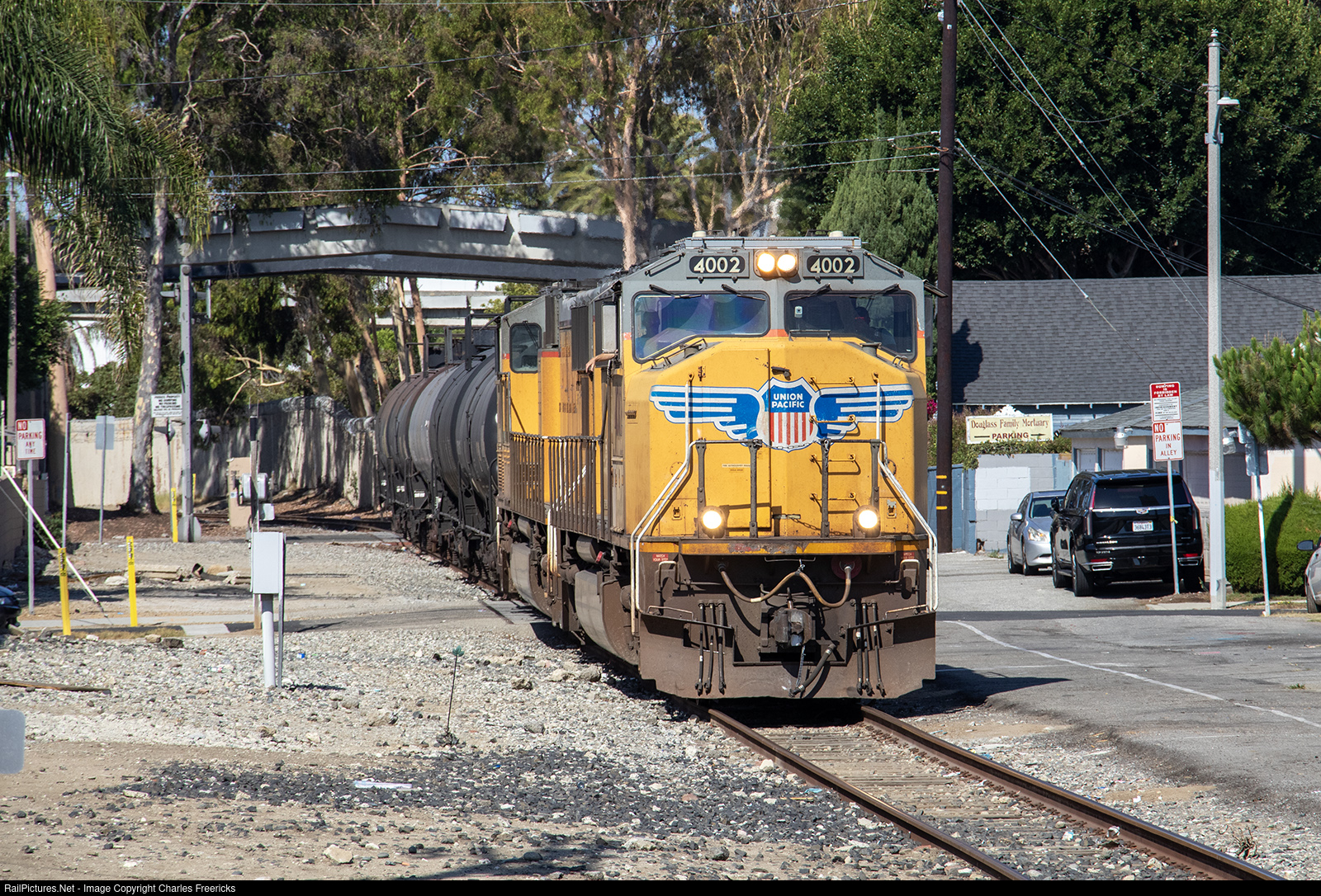 | The Union Pacific El Segundo Local (LOW10) heads east, having picked up its pulls at Wise and now passing through the abandoned Hawthorne Shopping Center. The train is heading back to Los Angeles behind a pair of SD70Ms. |