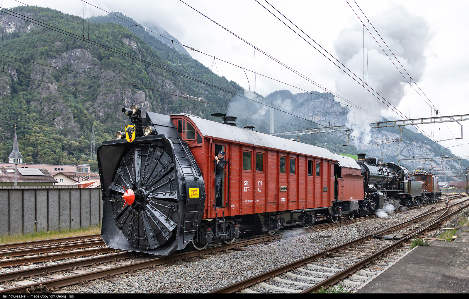 The snow fighting composition of Erstfeld is ready to clear the Gotthard line from snow. Steamlocomotive C 5/6 # 2978 and "Crocodile" Ce 6/8 II # 14253 are shoving the steam rotary snow blower Xrot # 100 under pressure towards the mountain in Erstfeld. This was the day when the snow blower, built in 1896 for the Gotthard Railway, returned to Erstfeld after long years in the Swiss Museum of Transport in Lucerne (from 1981), in the shed of Arth Goldau and in the Bahnpark Brugg.