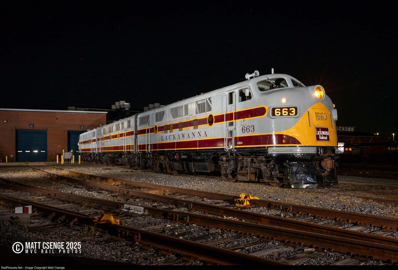 A trio of Delaware, Lackawanna & Western (DLW) F units shine bright behind the locomotive shop at Steamtown National Historic Site, which is exists on the grounds of and includes many structures from the former DLW roundhouse and shops! Front and center is F3A no. 663, with F7B no. 664B and F3A 664 coupled up and idling.