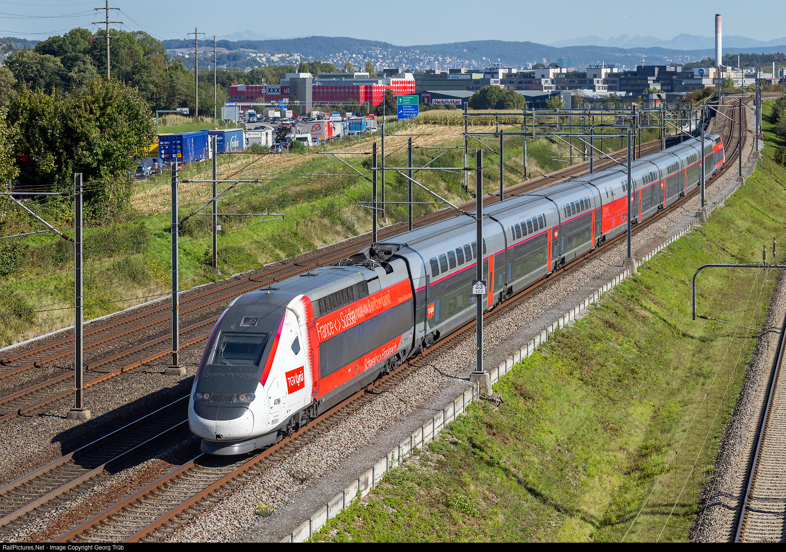 | TGV 2N2 # 4719 of hte Lyria is running the TGV 9226 from Zürich via Basel-Mulhouse-Dijon to Paris Gare de Lyon, between Dietikon and Killwangen-Spreitenbach. Above the front of the train, in the far distance, is 2504 meter high Säntis mountain, 75 kilometer (46 miles) away. |