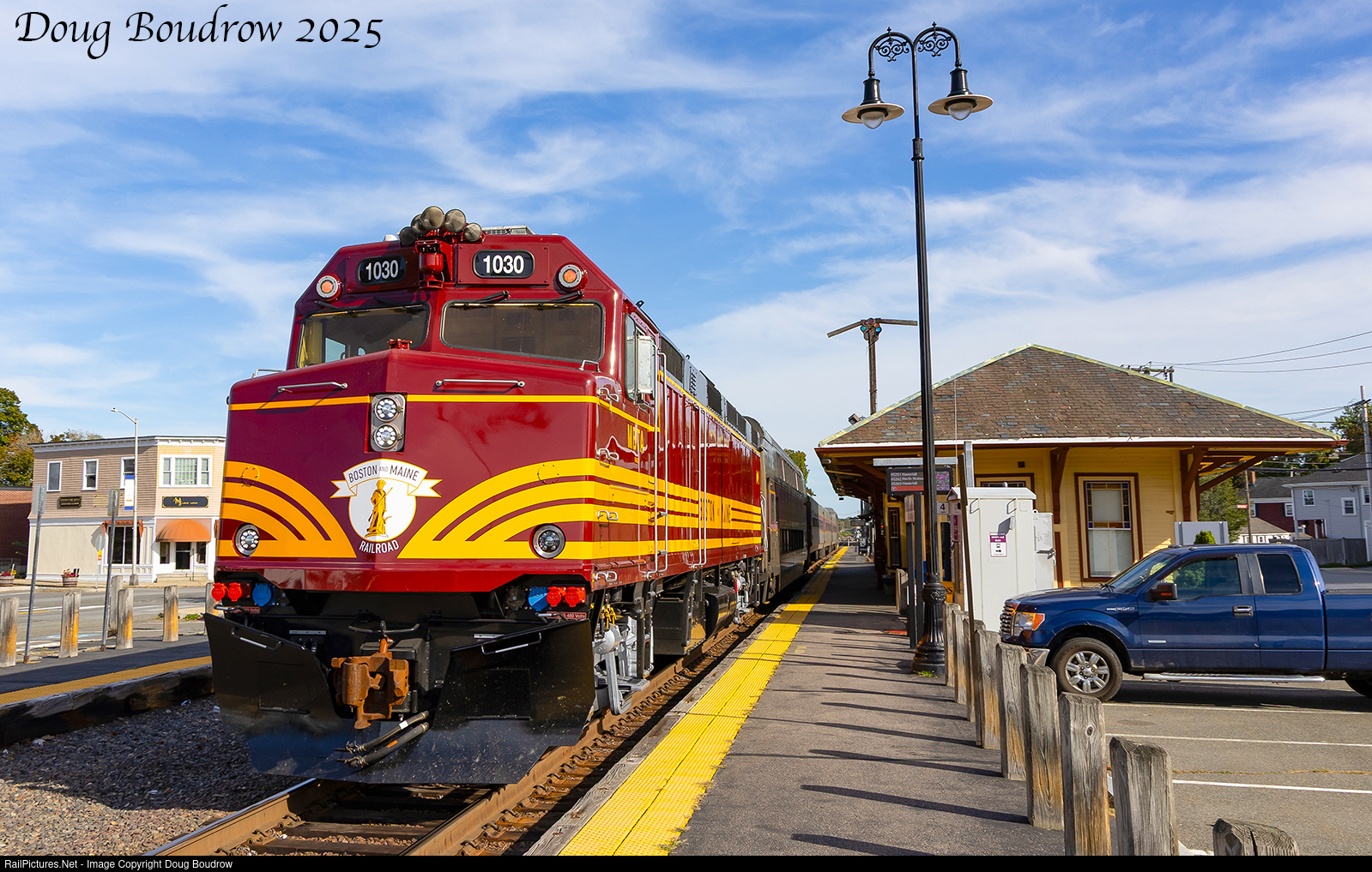 Freshly painted locomotive 1030 sporting a Boston & Maine heritage scheme is seen leading train 5251 outbound to Haverhill, stopping at Reading Station. The train is traveling on the former B&M Western Route