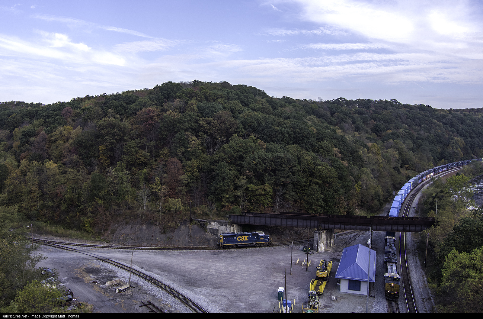 | CSX I11520 rolls west through Rockwood under the old connection with the Western Maryland. On the east leg of the S&C Wye is a locomotive that will most likely be picked up by a road freight and taken to Cumberland. The wye is the beginning the S&C Sub which run to Johnstown Pa. This line sees one weekday local a day and intermittent coal traffic.