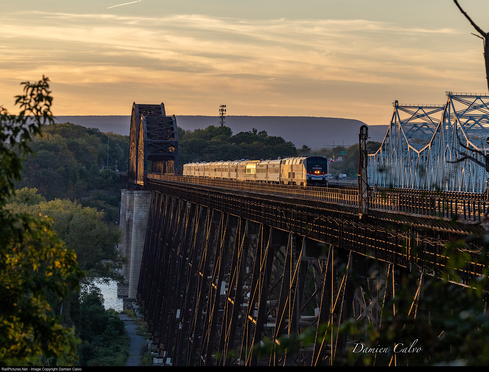 In an extremely random turn of events the BNSF OCS was re routed over the B&A to Springfield MA. The train originally was routed down Amtrak to LIRR but would not clear the third rail. Amtrak provided 2 P42DC’s 145 and 109, traveled south to CP 125 on the Hudson then up the Castleton Branch to Selkirk yard where they tied onto the OCS and went East. Here is the OCS crossing the Alfred H. Smith Bridge.