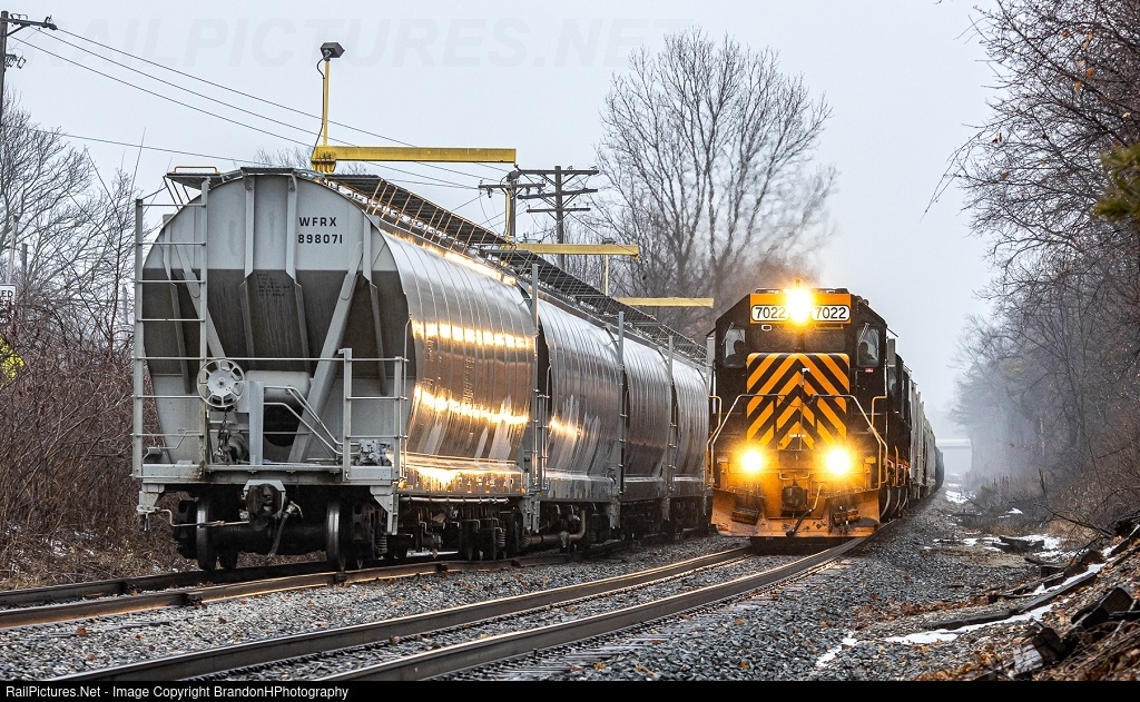 | Arguably my favorite Railroad in Ohio the Wheeling & Lake Erie, WE 7022 flies westbound through Norwalk Ohio with train 228 in to bound for Bellevue, in typical late winter fashion there is snow on the ground and light rain. |