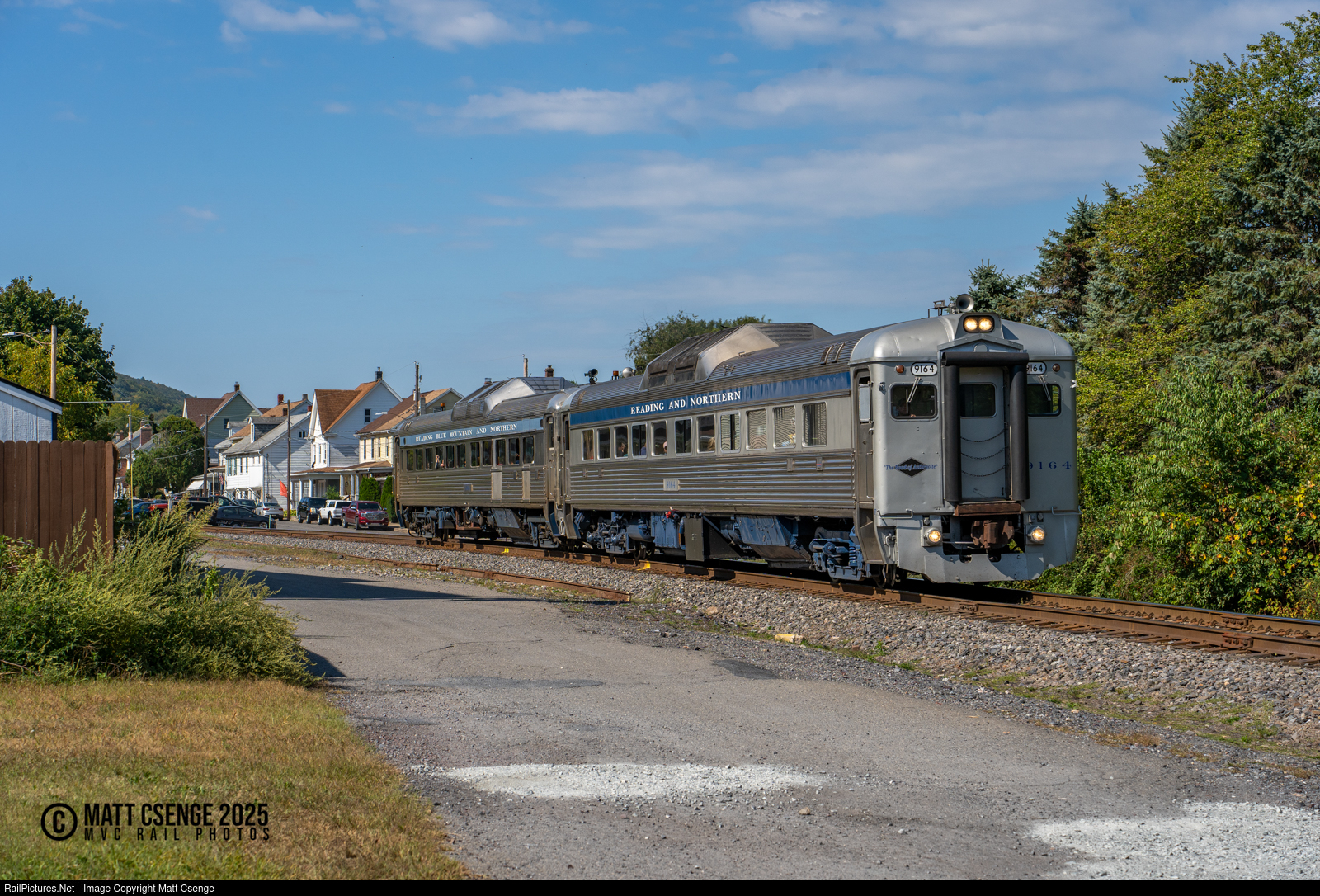 The horn of Reading, Blue Mountain & Northern (RBMN) train OSJT echoes through the valley as RDC-1 no.s 9164 and 9168 purr through Nesquehoning, PA en-route to Jim Thorpe. |