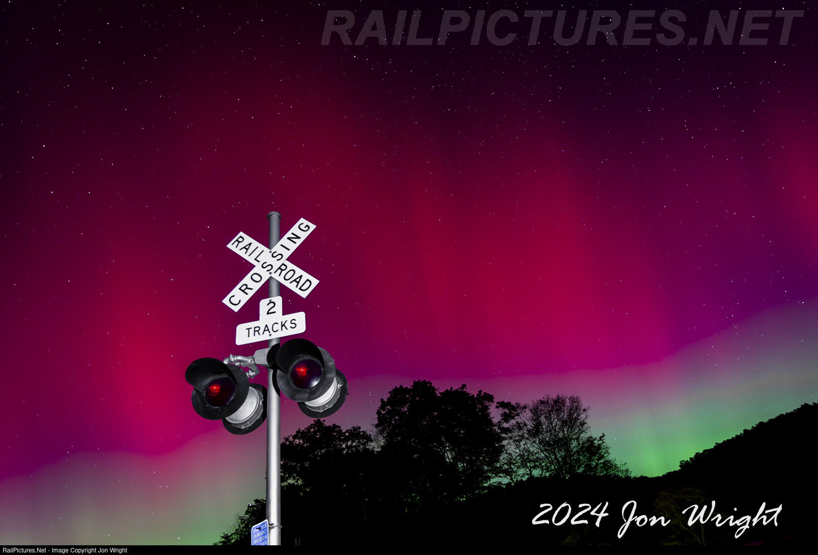The Northern Lights put on a show in the hollows of the Allegheny Mountains on CSX's Sand Patch grade. Seen here is the crossbuck for Fairhope Road framed against the colorful night sky.