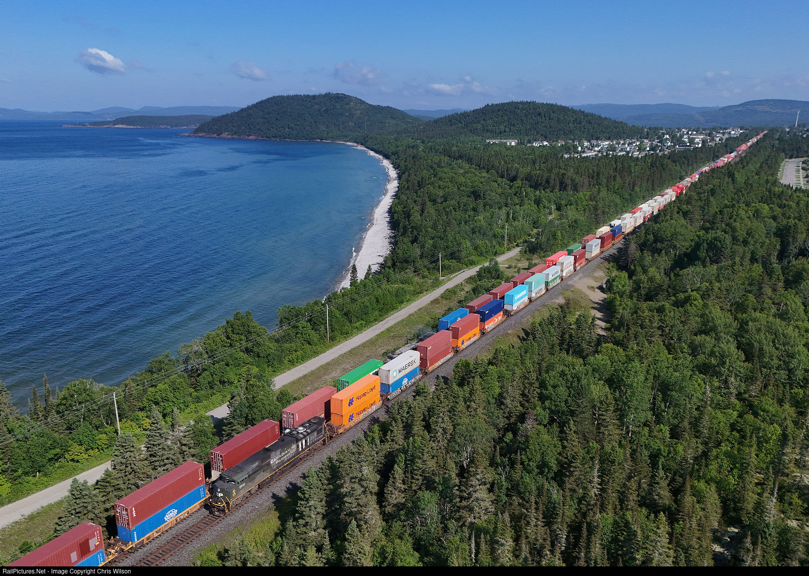 CP SD70ACU 6644 is one of five military themed locomotives proudly wearing the WW2 invasion stripes. Here they are heading down the main track at Marathon meeting 113 beside Lake Superior.