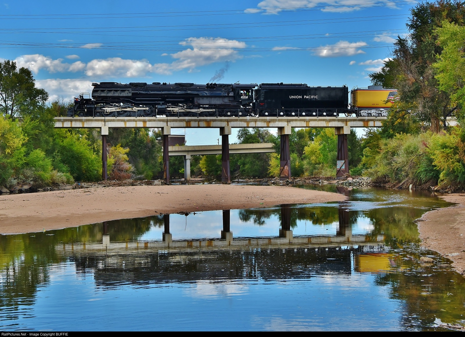 | Union Pacific's Big Boy #4014 (4-8-8-4) runs over the South Platte River in Denver, Colorado as it makes its second run of the season.