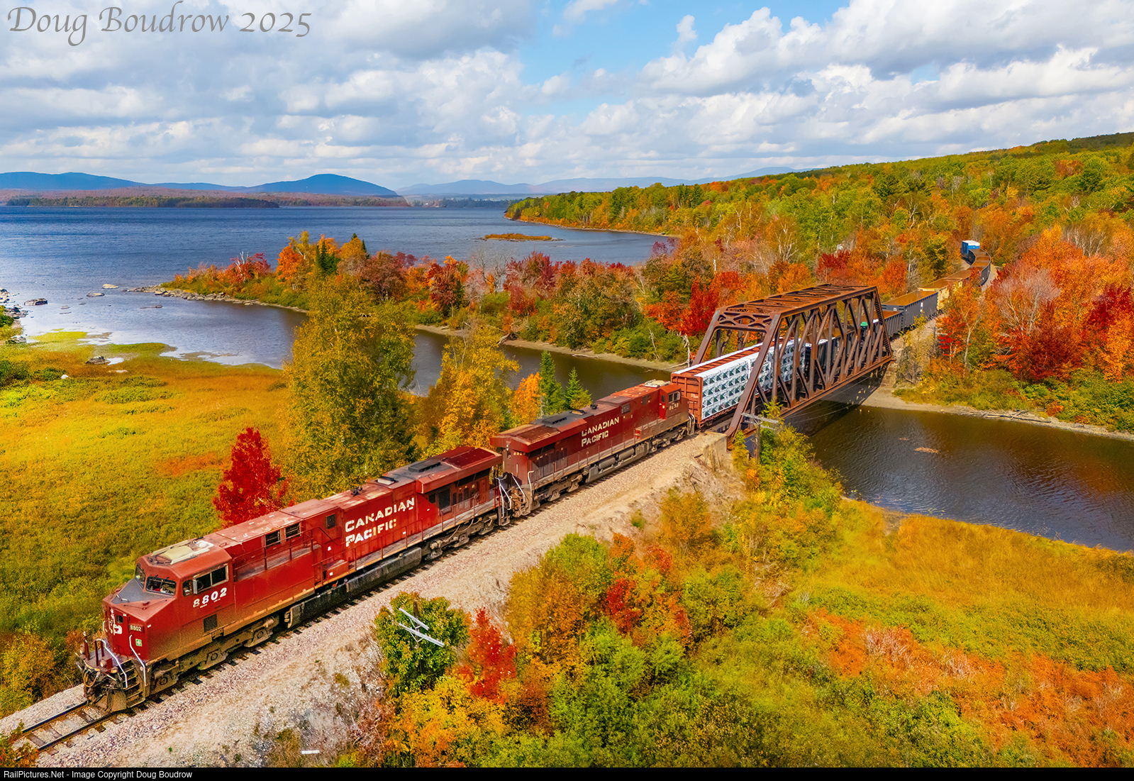 | CPKC train 121 has the Canadian crew on board as the depart Jackman. The train is crossing the Pat McKinney Bridge over the inlet that connects Wood Pond, seen in the background to Attean Pond. In less than an hour, the train will be crossing into Canada at Boundary. |