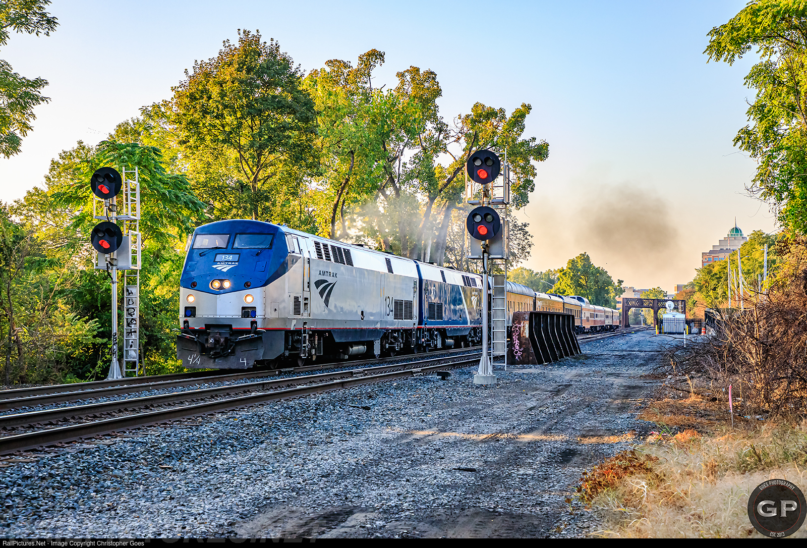 | Sunshine was gold through the trees as the 134 & 87 lead Amtrak 885 as it climbed the hill out of Rensselaer through Albany pulling the 2025 AAPRCO “American Autumn Explorer VI” as they got underway out of Rensselaer through CP-145. |