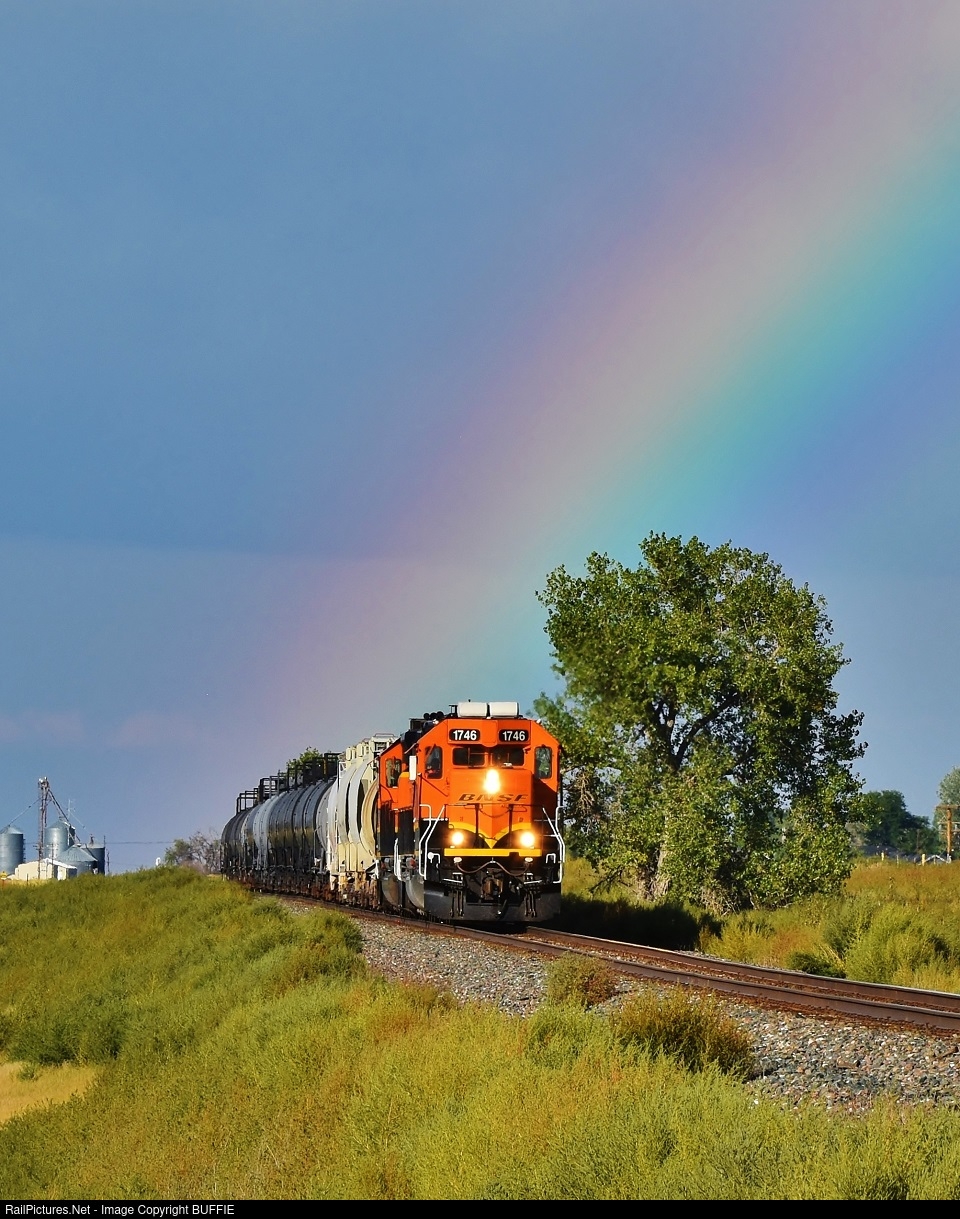 | A large and colorful rainbow provides the backdrop as BNSF 1746 (SD40-2) runs west on the Brush Sub between Hudson, Colorado and Denver.