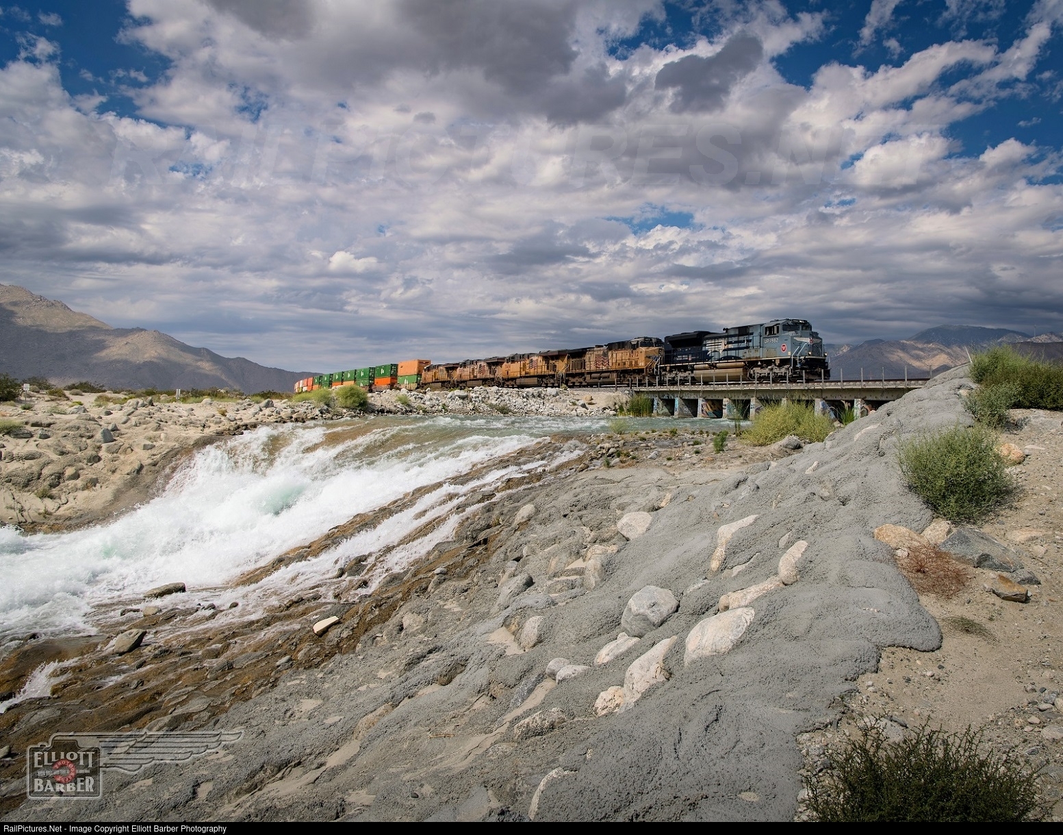 | UP 1982 glides downgrade as it crosses over the rushing Whitewater River. The train of 'stacks' and 'pigs' originated in City of Industry and is headed east to Union Pacific's Global IV Intermodal Terminal in Joliet, IL. |