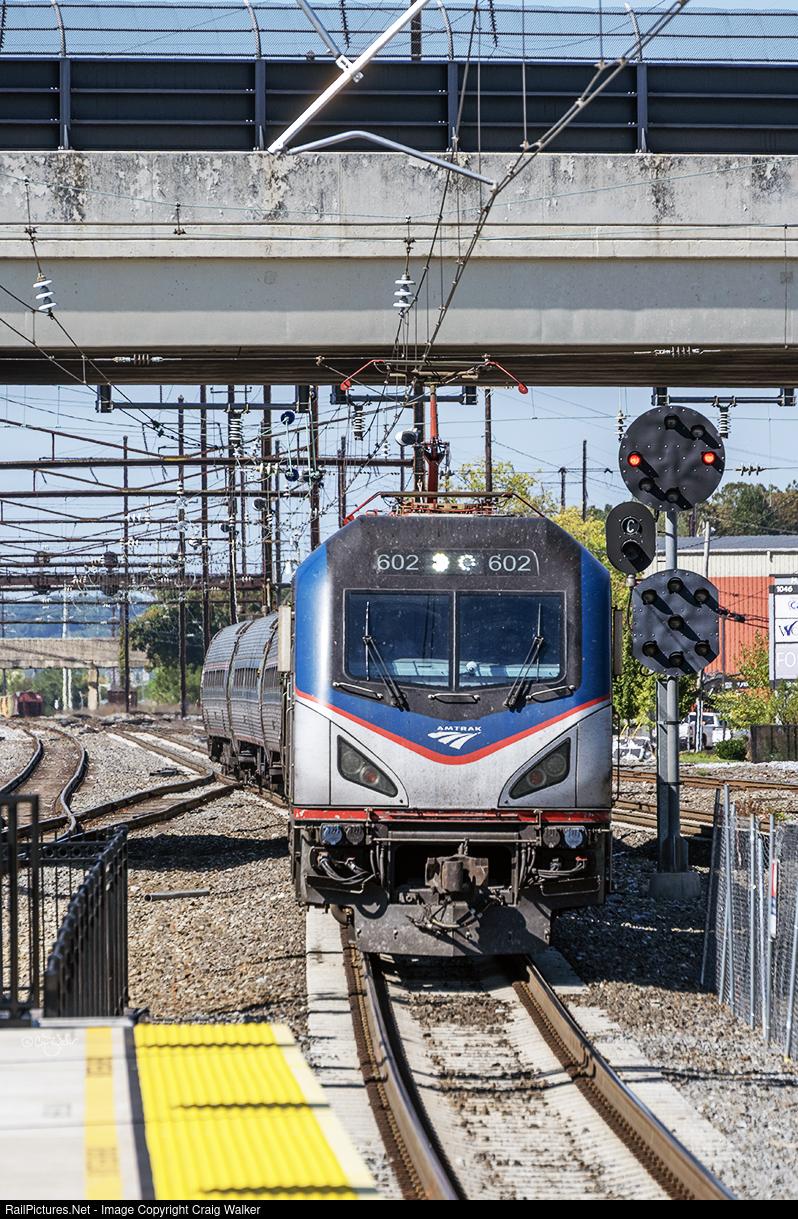 Amtrak train 666, a westbound Harrisburg to New York Keystone Service train, rolls into the Lancaster station right on time. This train, with ACS-64 "Cities Sprinter" 602 for power, originated in Harrisburg and is bound for New York City. (Lancaster, Pennsylvania – September 28, 2025)