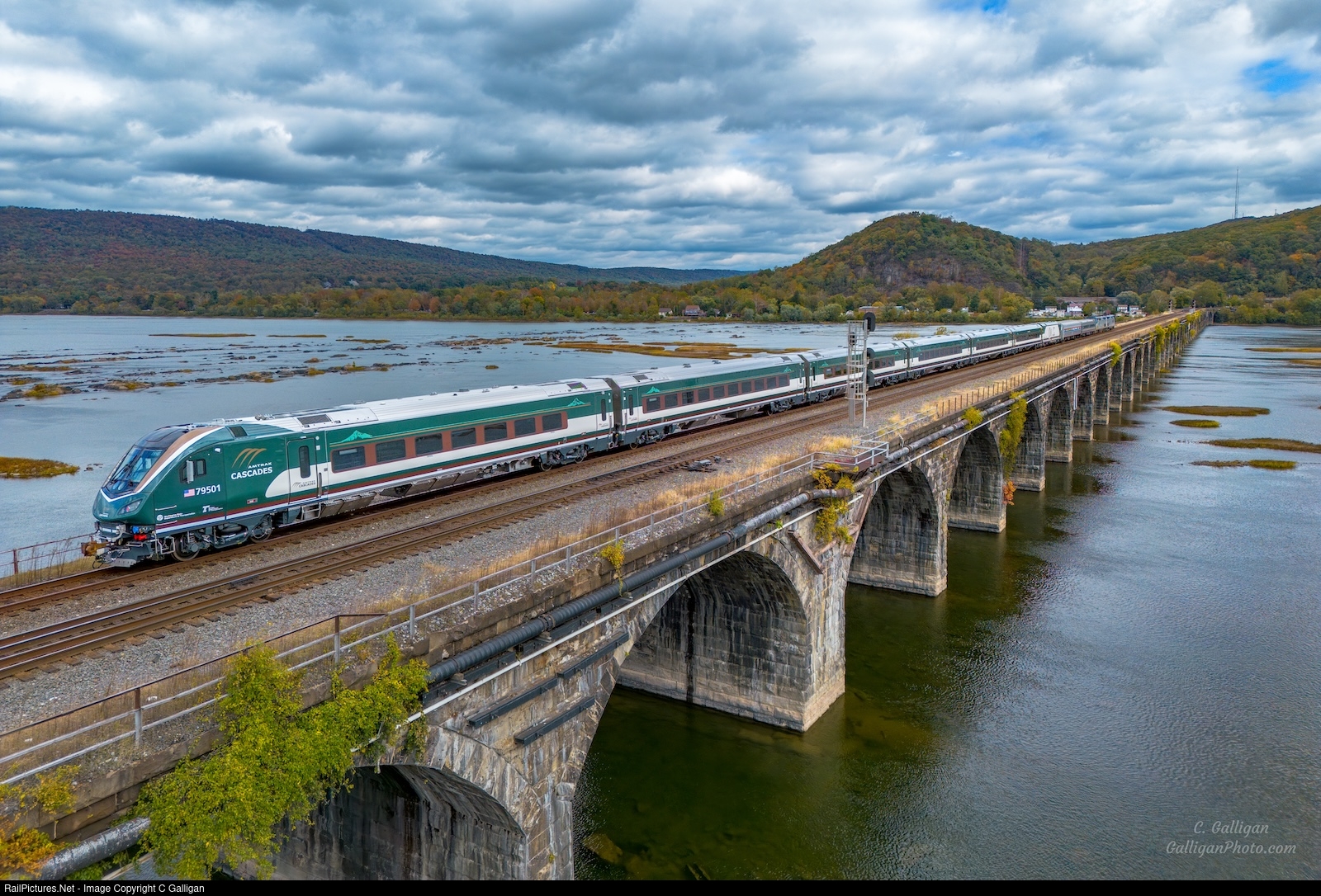 The first set of Siemens Airo equipment for the Amtrak Cascades Service crosses the Rockville Bridge in Marysville, PA, enroute from the Transportation Technology Center in Pueblo, CO.