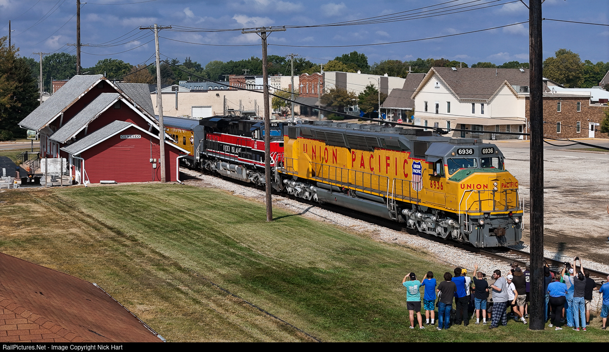 The photo line is packed as UP 6936 and IAIS 513 hustle the Quad Cities Rocket through Geneseo, passing the nicely restored Rock Island depot.