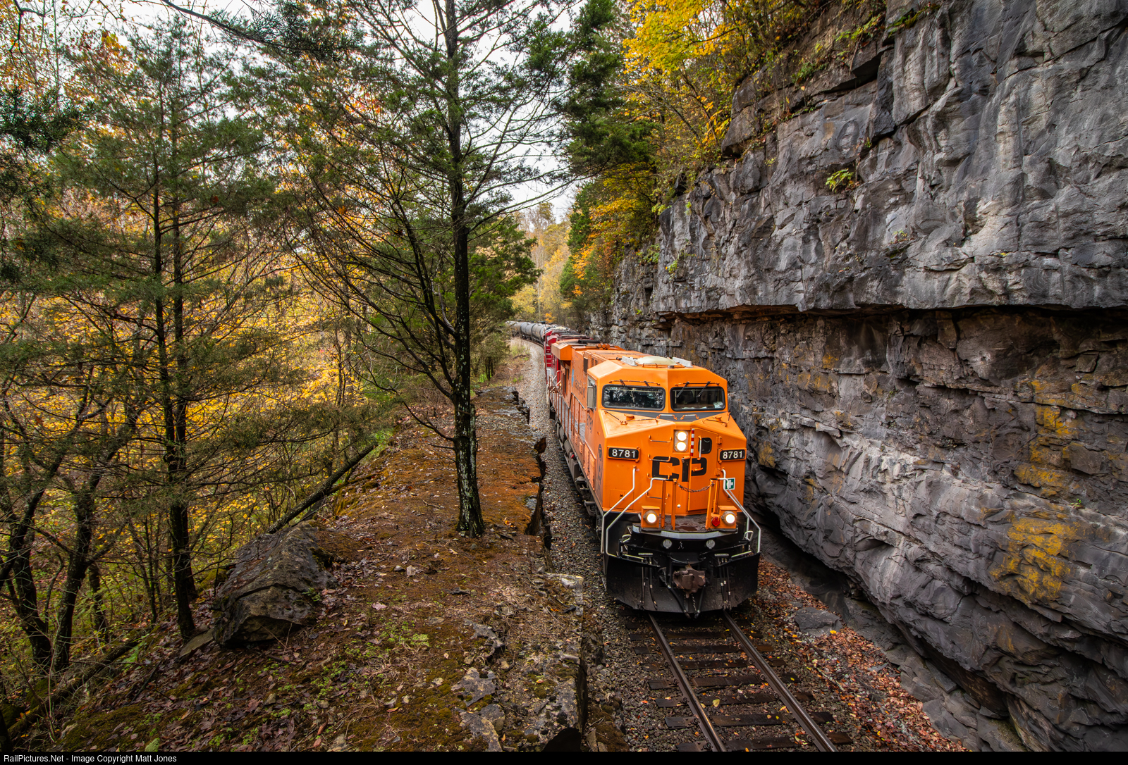 Canadian Pacific's Hapag-Lloyd unit leads Southbound ethanol loads down Cumberland Mountain at Tantallon. The units bright orange paint compliments the Autumn scenery well.