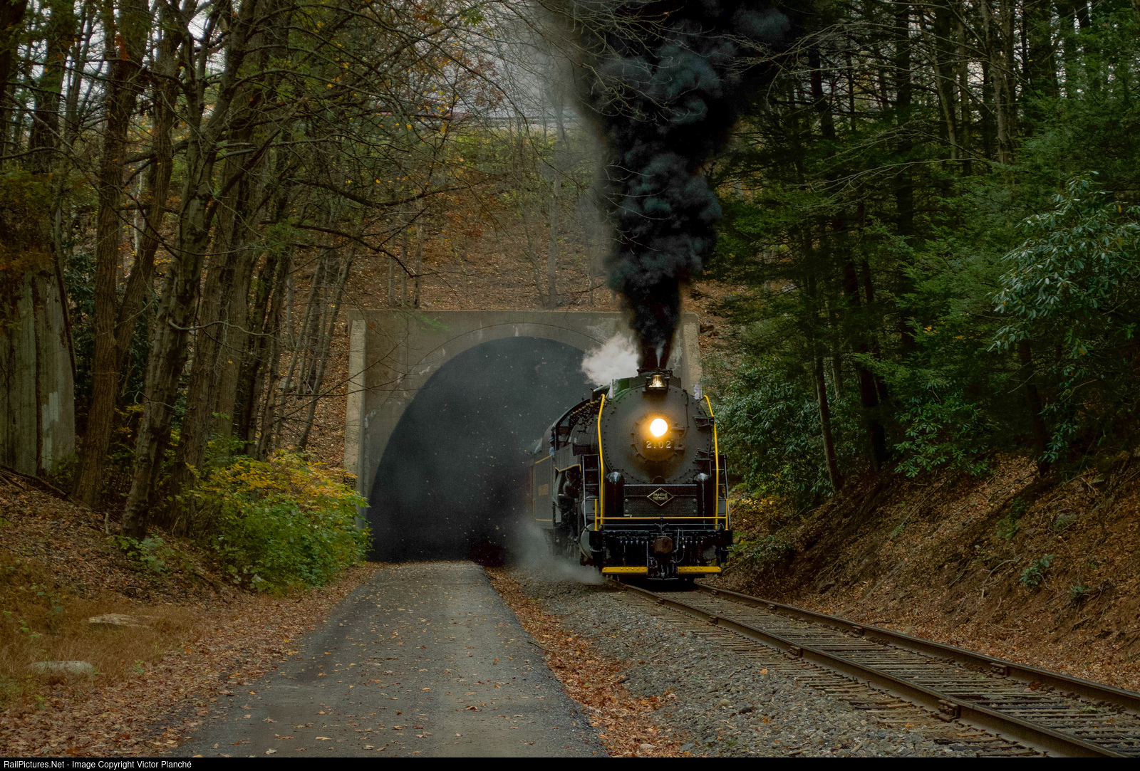 | The last steam-powered Fall foliage excursion of the year is passing by the Nesquehoning Tunnel, en route to Reading Outer Station. |