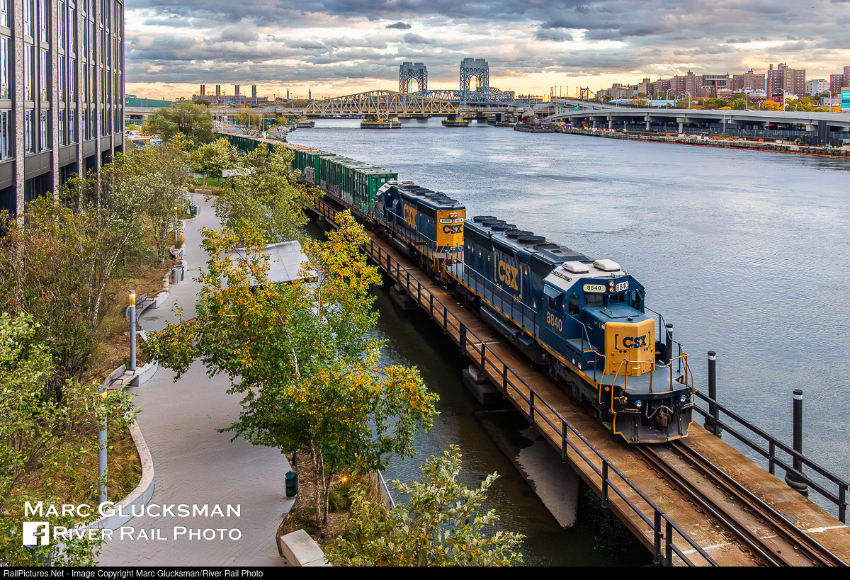 SD40-2 Pair On The Link. On Friday, October 31, 2025, CSX M701(30) (Selkirk, NY-Bronx, NY) was a late arrival into Croton-On-Hudson, New York. As often happens, the train was tied down, and a yard crew, Y102, was taxiied to the train to bring it the last miles to Oak Point Yard in the Bronx, New York. This caused the train to travel in daylight, while its movements are normally all in the dark. These locomotives, CSXT 8854 (née-CR 6496, SD40-2, 8/1979) and 8840 (née-CR 6465, SD40-2, 10/1978), made a quick turn to switch cars and lead that evening's M702(31) (Bronx, NY-Selkirk, NY). EMD SD40-2s are becoming rare to see on this line as the number of AC44CWs and CM44ACs increases, so it was nice to catch a pair on the road. The train on the Oak Point Link, viewed from the Third Avenue Bridge looking south at Waste Management with the Willis Avenue, Hell Gate, and Triboro (RFK) Bridges in the background.