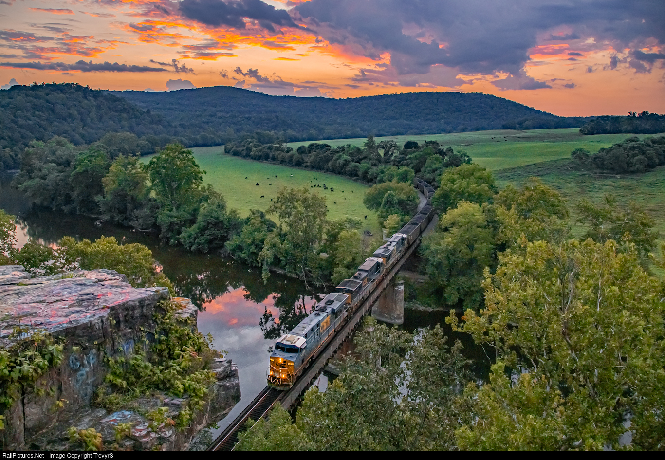 A loaded double barrel crosses the James River under a stunning sunset.