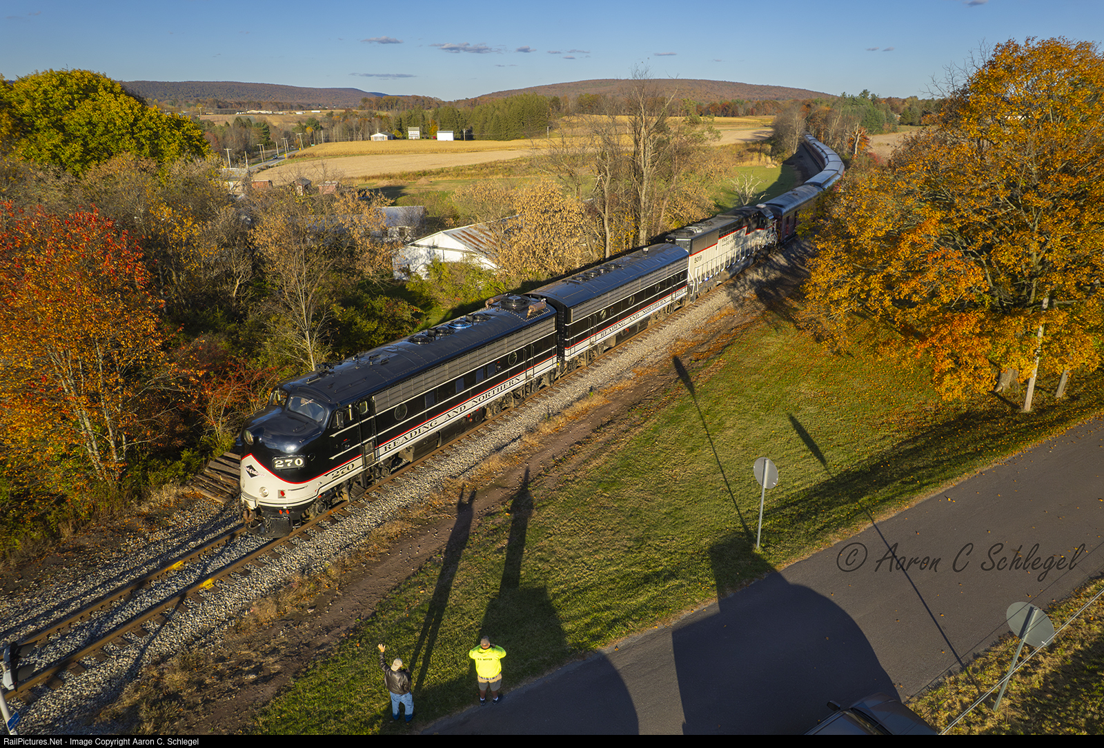 | The RBMN 270 leads the OSJT train from Jim Thorpe back to Reading through the Quakeake, PA countryside. As the sun gets lower the Railfans get in the last shots of the day. Here the Mayor of Kutztown and his Son wave and get their photos with the fall foliage. |