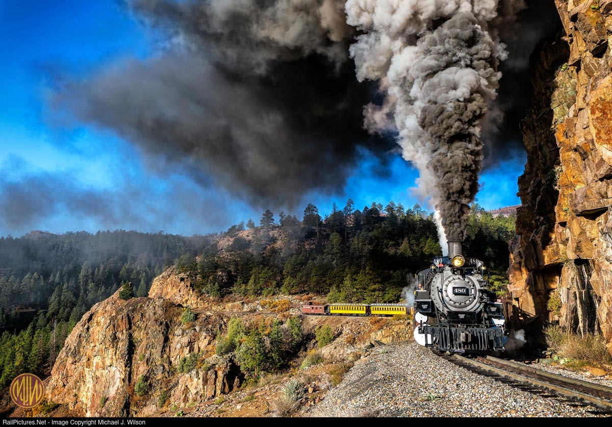 Durango & Silverton K-36 #480, the first in a class of 10 narrow gauge 2-8-2 locomotives built by Baldwin in 1925, stomps along the High Line of the former Denver & Rio Grande Western enroute for Silverton, CO on October 24, 2025. This was taken as part of the D&S' K-36 100th anniversary event.
