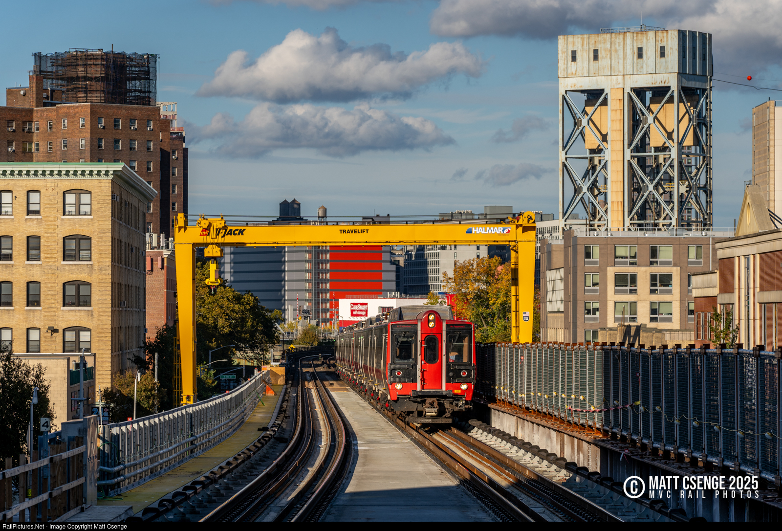 Metro-North Railroad (MNR) M8 no. 9709 is the lead unit on non-revenue train 2012, seen approaching Harlem-125th Street Station on its way to Grand Central from Highbridge Yard. The large Travelift seen here is part of the ongoing Park Avenue Viaduct replacement project; it is used to lift old steel sections of the bridge out of place and bring in the new concrete structure. |